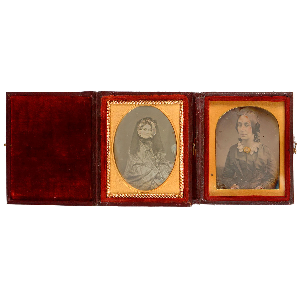 Anonymous, 1/9 plates, portraits of ladys, hand-tinted and gold-colored, brass passe-partouts, stamping on cases: "E. Fehrenbach Artist III Strand" and "C.B. to C.R.", both cases complete.