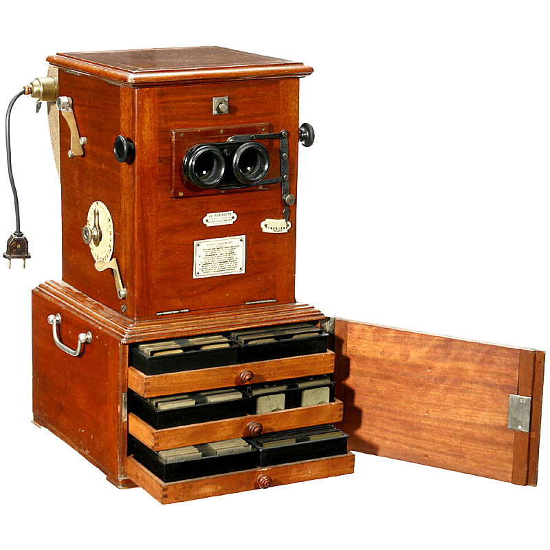 制造商:"Jules Richard 巴黎",影像卡片45x107毫米,高级木制,黄铜配件,可调试目镜,有内阁,高49厘米,12个片匣大约300张黑白影像卡片,大部分是欧洲的家庭情景卡片和旅游卡片,有可动的电力照明装置。