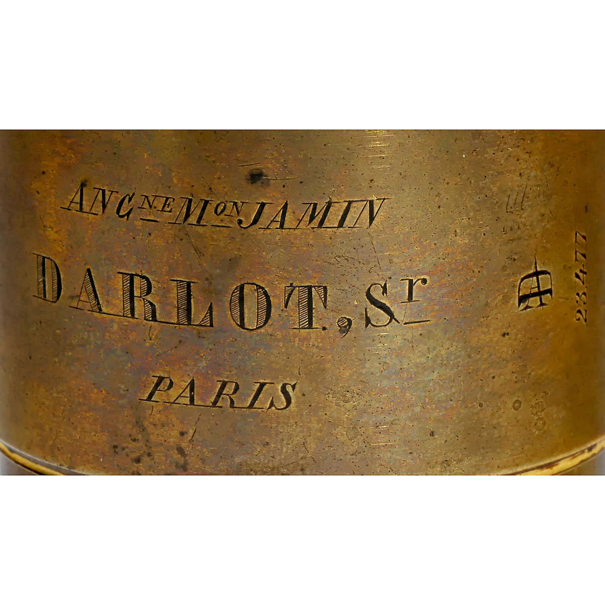 Camera unmarked, presumably France, plate size 8 x 11,5 cm (1/4 plate), camera size 5 1/6 x 8 ¼ x 6 ¾, focusing screen back, camera back with collodion stains, with portrait lens by Jamin/Darlot, engraved: "Ancne Mon Jamin Darlot. Sr Paris", no. 23477, focal length approx. 20 cm, one front and rear element with handwritten credit, rack-and-pinion focusing, camera body distorted, cannot be closed.