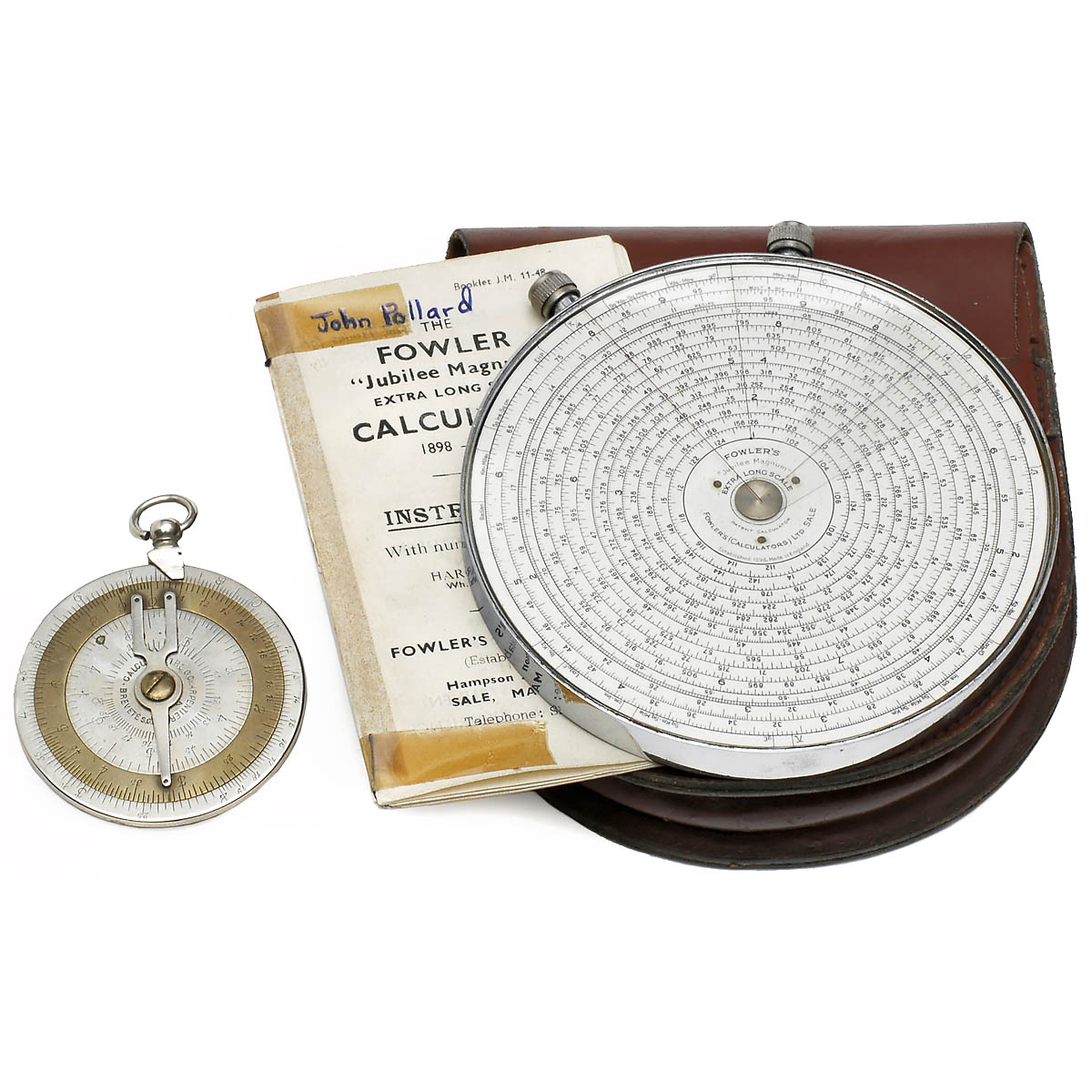 1) Patented French logarithmic device by G. Charpentier. Made by Tavernier – Gravet, Paris, double-sided. Diameter: 2 1/3 in. Very rare! – And: 2) "Fowler's Jubilee Magnum Extra Long-Scale, c. 1948. 4 ¾ in. diameter. With manual and leather case.