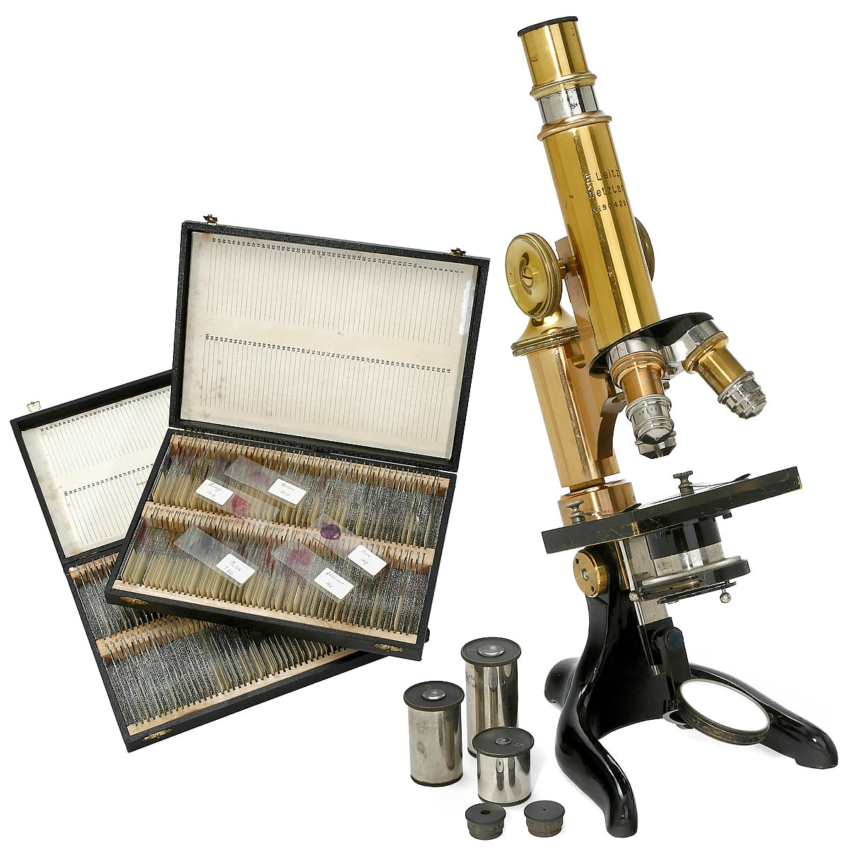 No. 90429, original lacquered brass, black painted cast-iron horseshoe base, double mirror, condenser, triple nosepiece, 3 objective lenses, 4 oculars, height 11 in., in matching mahogany case with the corresponding serial number. Including 2 boxes with human specimens.