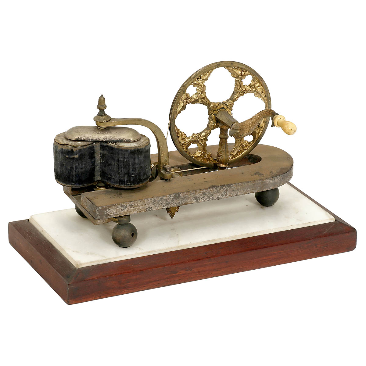 Used to generate electric shocks for medical purposes; brass, horseshoe magnet, 2 coils, handcrank, bone handle, on marble and wood base.