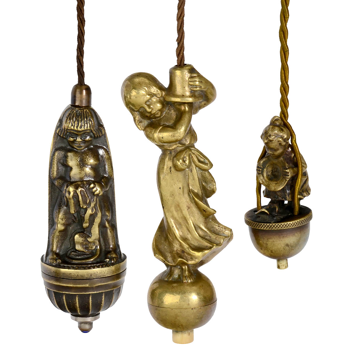 1) Girl with doll, bronze, carved bone head acts as a switch, embossed number 0782 on the base, height 3 in. – 2) Woman, finely carved bone face, bronze, height 2 ½ in. – 3) Double-sided relief of a mischievous boy, bronze, height 3 ¾ in. – 4) Girl catching butterfly with hat, bronze, height 2 1/3 in. – And: 5) Graceful girl, bronze, signed "A. Tereszczuk", Vienna, height 4 ½ in.