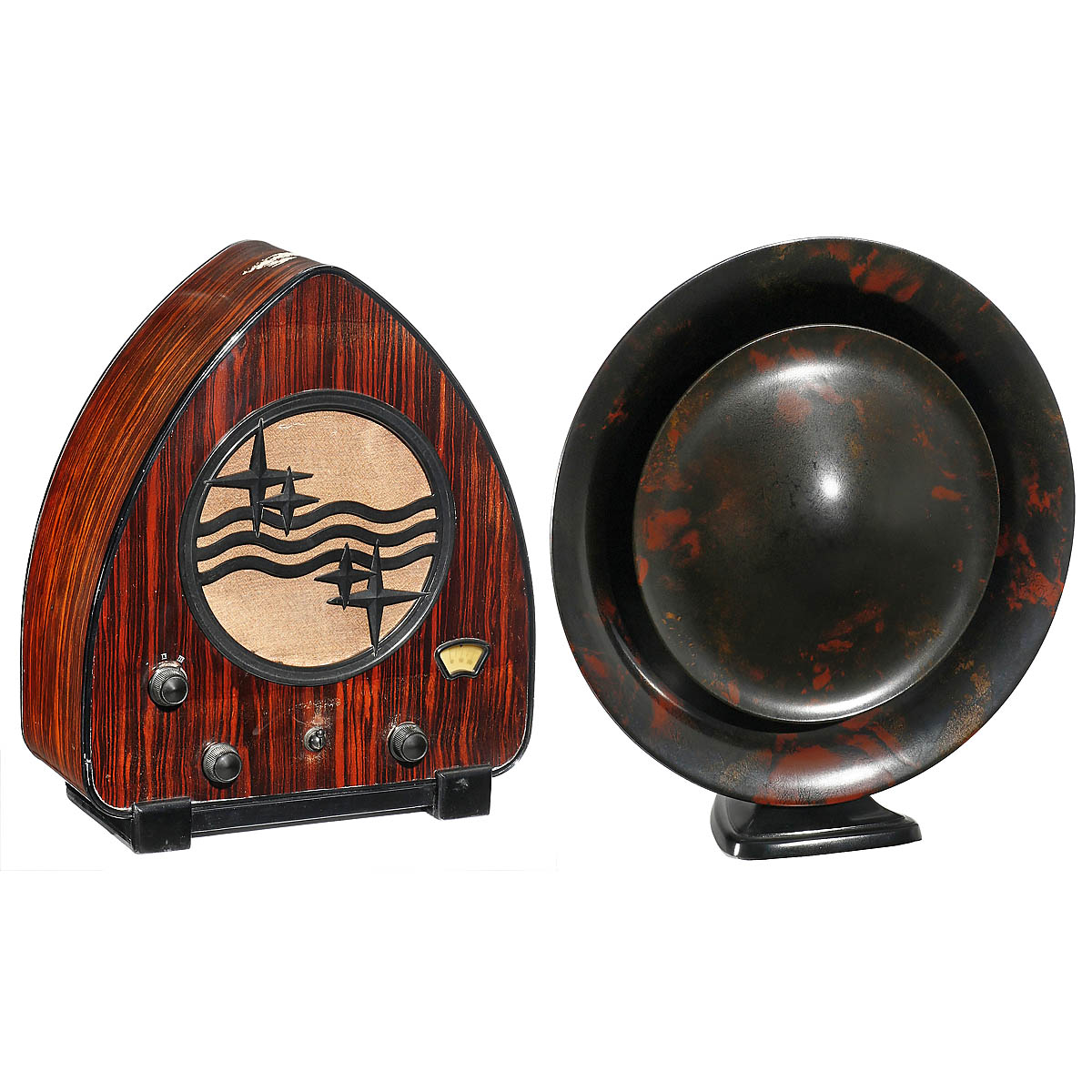 1) Philips 930A radio, 4 valves, mains-powered, minimal damage to the paintwork. – And: 2) Art-Deco bakelite loudspeaker, designed by Louis Kalff.