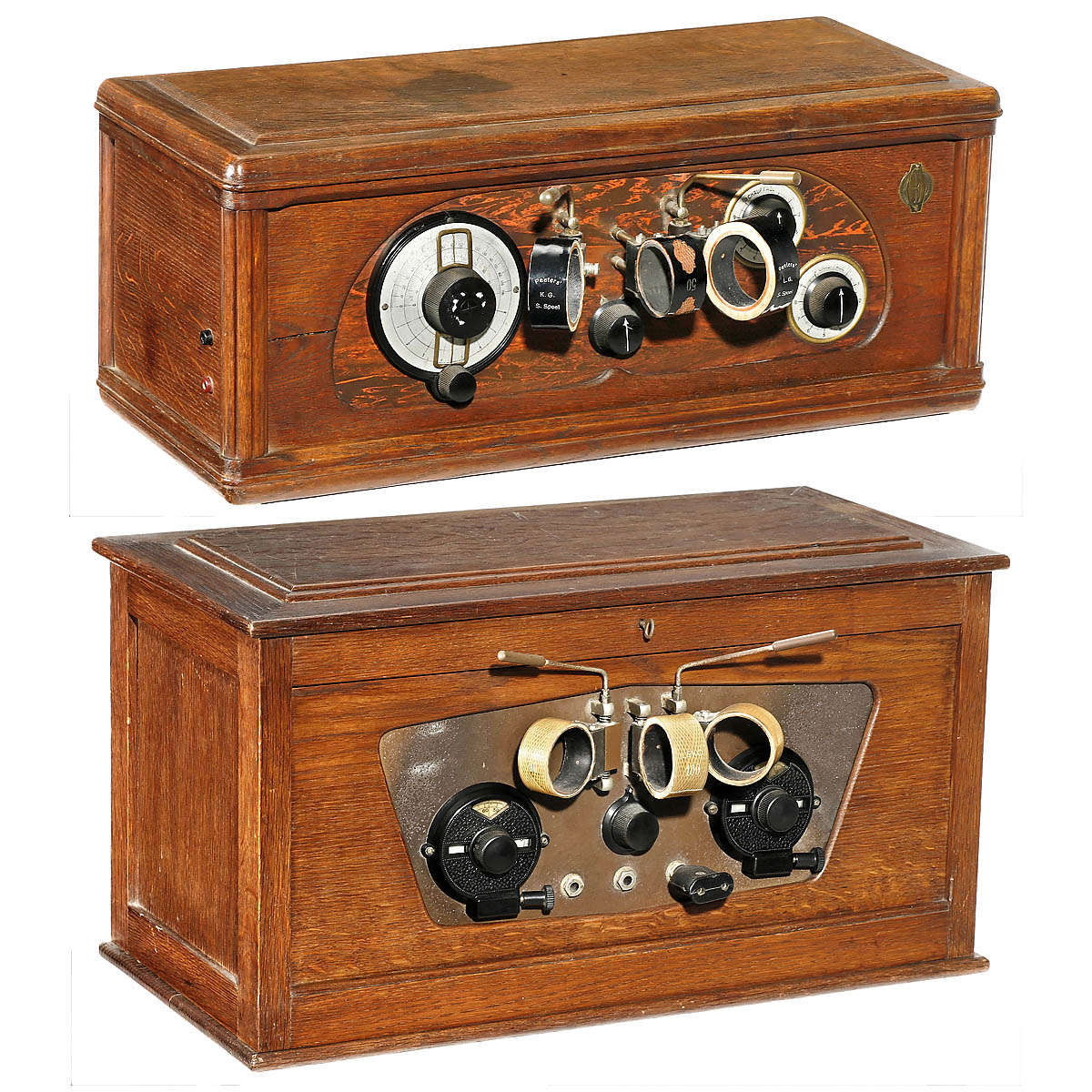 1) Marked "ED", 3 valves, 1 plug-in coil, 2 swivel coils. – And: 2) Unmarked, 4 valves, 3 swivel coils. – In oak cases with lids.
