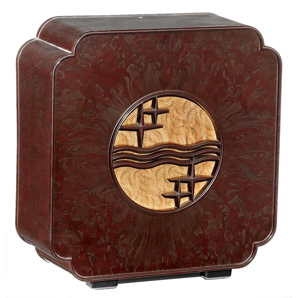 1) Radio model 824A, super inductive principle, 5 valves, LW + MW, mains-operated, bakelite case. – And: 2) Loudspeaker model 2123, magnetic system, bakelite case.