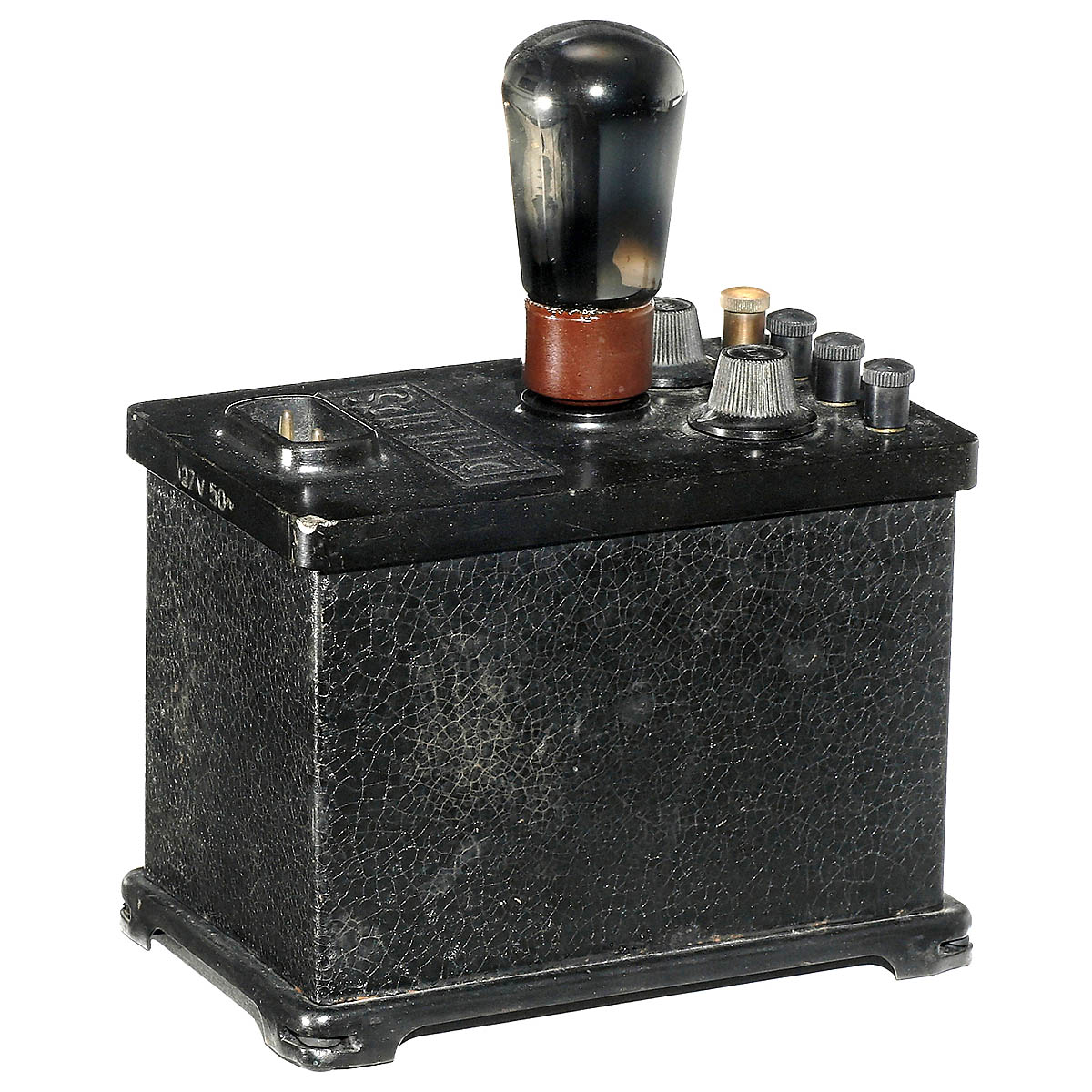 1) Radio model 2514, 4 valves, mains-operated, metal case. – 2) Anode voltage supply model 3002. – 3) Radio model 2515, 3 valves, mains-operated (110 V), metal case. – 4) Radio attachment Philector 4180, bakelite case, used for increasing the selectivity. – 5) Power supply model 372. – And: 6) Bakelite speaker model 2028, coil resistance 1.500 ohm.