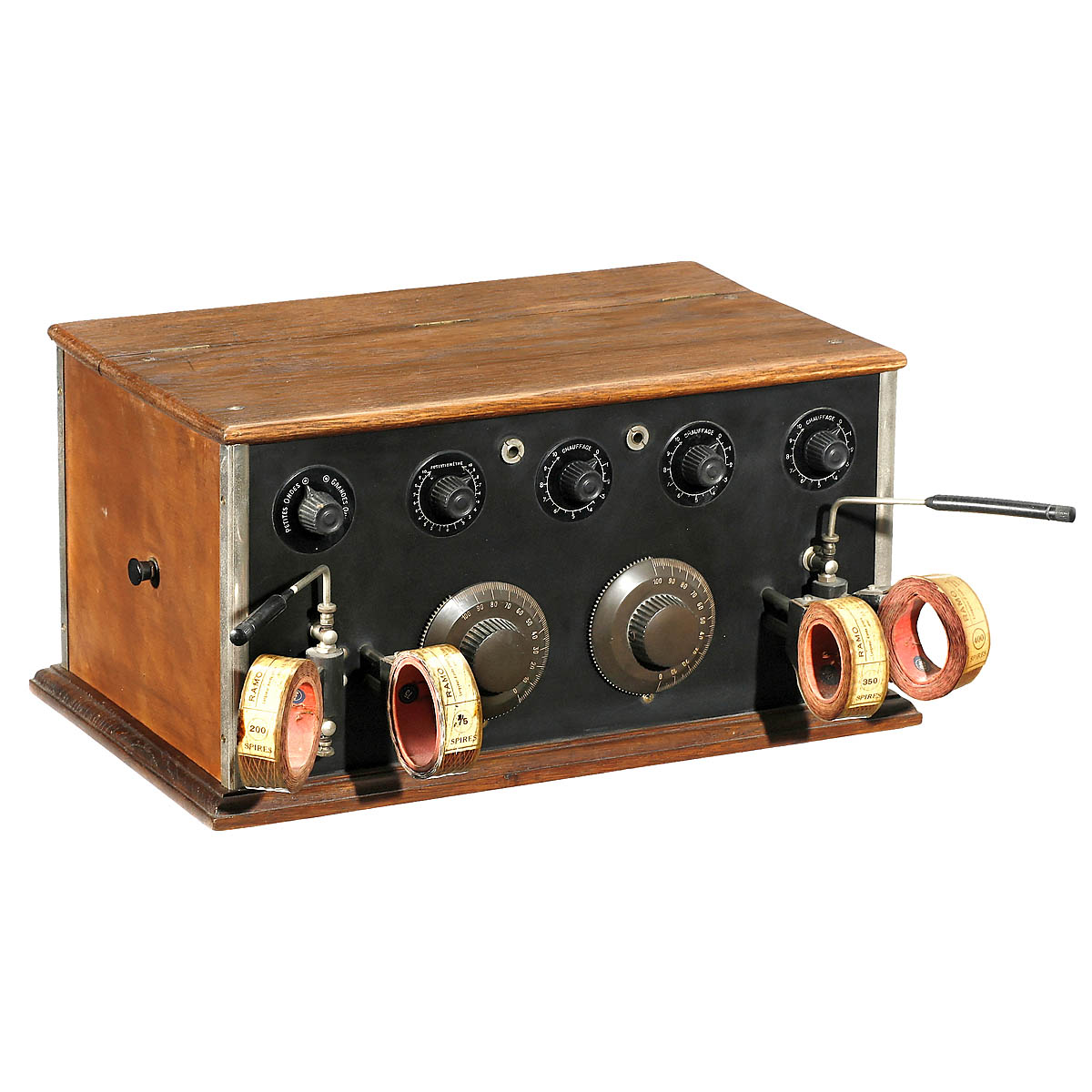 1) Oak case, ebonite front, 2 swivel coils, 4 valves (4 x KC1), width 16 ½ in. – And: 2) Oak case with drawer, 3 swivel coils, 4 valves (Philips A409, A415 and 2 x B405), width 20 ½ in.