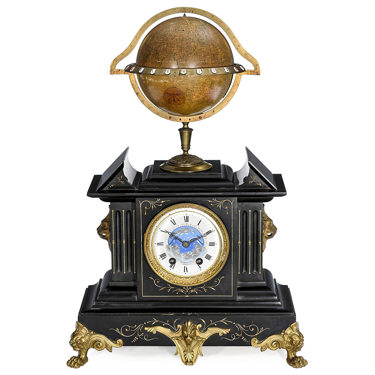 Signed on movement and globe "Edouard Serin, Paris", black marble case with 5 figural lion's heads and front claw feet, enameled Roman dial signed "Parmentier à Bruyères", inset subsidiary moon phase dial, with 5 ½ in. terrestrial globe on brass stand, the equatorial ring mounted with 24 Roman enamel cartouches, overall height 21 ¼ in., working movement, connection between movement and globe needs adjustment.