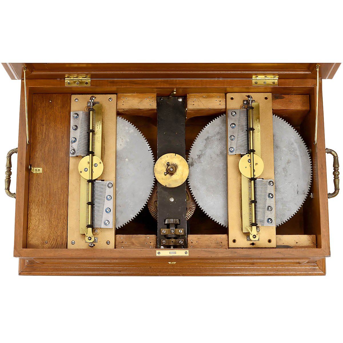Symphonion Musikwerke, Leipzig. With twin discs playing side by side, Ø 11 ¾ in., 2 sets of combs with 42 teeth each (complete), walnut case with rosewood panels, floral marquetry inlaid lid, gilt "Symphonion" name incised on inner lid, front with crank, width 32 in., excellent restored condition. With full and expressive sound. With 2 sets of discs: 3208 "Wenn die Schwalben heimwärts ziehn" and 3518 "Chimes of the Deep".