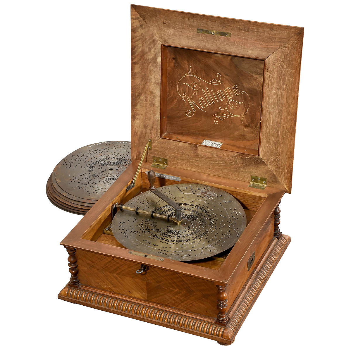 Manufactured by "Kalliope Musikwerke, Leipzig", for 13 1/3 in. discs, 61 teeth in comb (complete), 10 optional bells, good playing condition. With 9 discs.