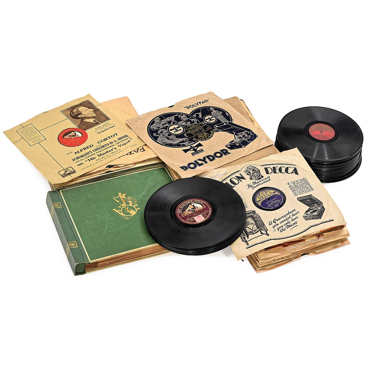 1) Early Emile Berliner disc, dated 25.08.1898, no. 6278, "Dancing in the Barn". – 2) 43 discs of 12 in., including 4 x Enrico Caruso, 1 x Wilhelm Furtwängler, 1 x hit potpourri of the 1930s, 1 x Arthur Rubinstein. – 3) 6 sapphire discs Pathé. – 4) 7 mechanical organ discs of 10 in. – 5) 25 discs of 8 in. – 6) Approx. 38 discs for children. – And: 7) Approx. 125 discs of 10 in. – In addition: Philips portable turntable with valve amplifier, model SK 80, working.