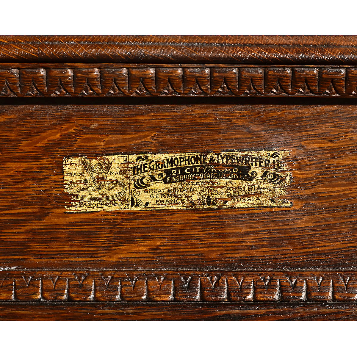 Gramophone & Typewriter Ltd., London. Oak case, Exhibition soundbox, 12-panel flared wood horn, gilt transfers on case and horn, working condition but needs some regulation, horn with minor splits.