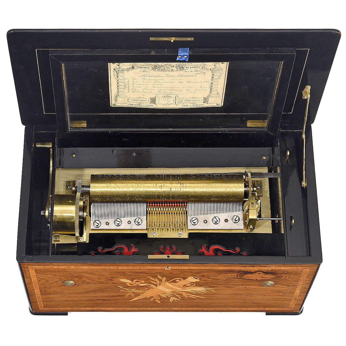 No. 40962, playing six airs including "Les Huguenots, Marche" and "Lucie de Lammermoor", Gamme No. 119, with two combs of 38 teeth each (complete), 16-note organ, compensated governor, flat-topped winding lever, tune-sheet and attractively figured veneered case with amphora inlay on front and motif of urn and mu-sical trophies on the lid, wd. 20 ¾ in. (53 cm), cylinder 10 ¾ in. (27.5 cm). Excellent restored playing condition.