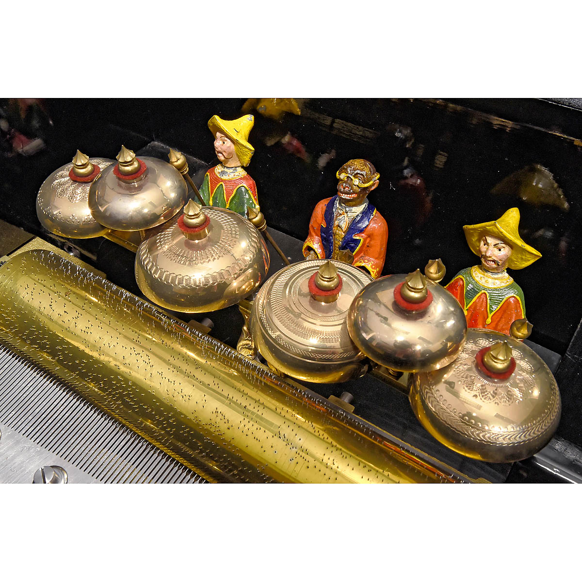 No. 3482, playing four lively dance airs accompanied by six bells struck by two Mandarin automata and a well-dressed monkey with spectacles, with original painted decoration, articulated heads and arms, 100 teeth in musical comb and six teeth in percussion comb (all complete), serpentine winding handle with double-fingered grip, retailer's tune-sheet of "Carlo Stolberg jun., Bahnhofstr. 38, Bremen", attractively figured veneered case with inlay of eagle on the front and trailing alpine flowers on the lid, wd. 19 ½ in. (50 cm), inner glass lid slightly warped. Superb restored playing condition. A most unusual format and set of arrangements. For a musical box with an equally unconventional selection of figures by the same maker, see Auction Team Breker, 21. May 2016, Lot 482.