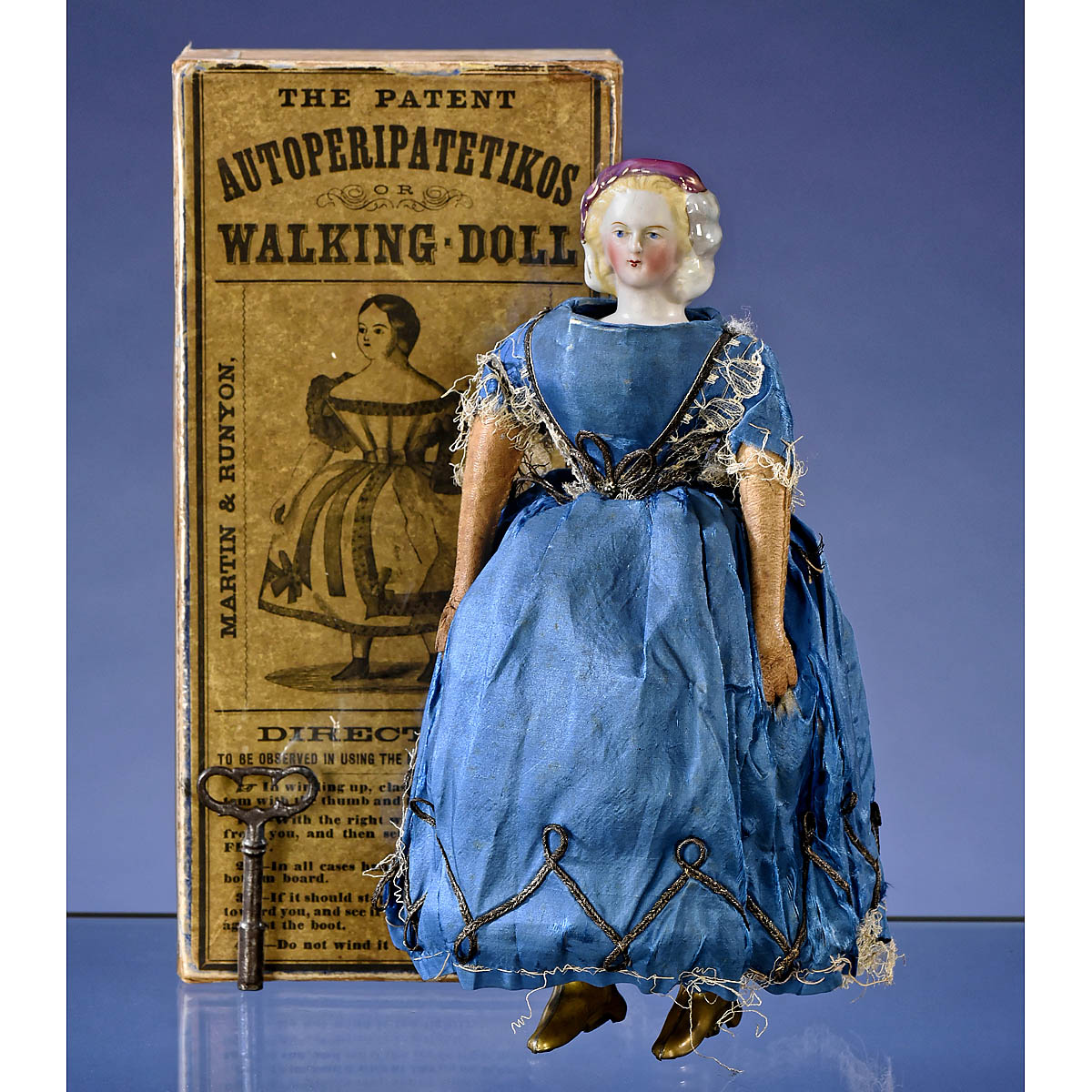With bisque shoulder-head, closed mouth, painted blue eyes, molded and painted blonde hair swept back from forehead into a snood and decorated with lustre feather and pink band, conical card skirt with patent dates of 15. July 1862 (America) and 20. December 1862 (Europe), leather lower arms, open-spring motor, mechanical brass boots and original blue silk-taffeta costume trimmed with metallic braid, ht. 9 ½ in. (24 cm), skirt somewhat fragile, good working condition. With steel key. In original box with illustrated label, instructions and address of "299 Broadway, New York". – An attractive boxed toy in overall good condition.