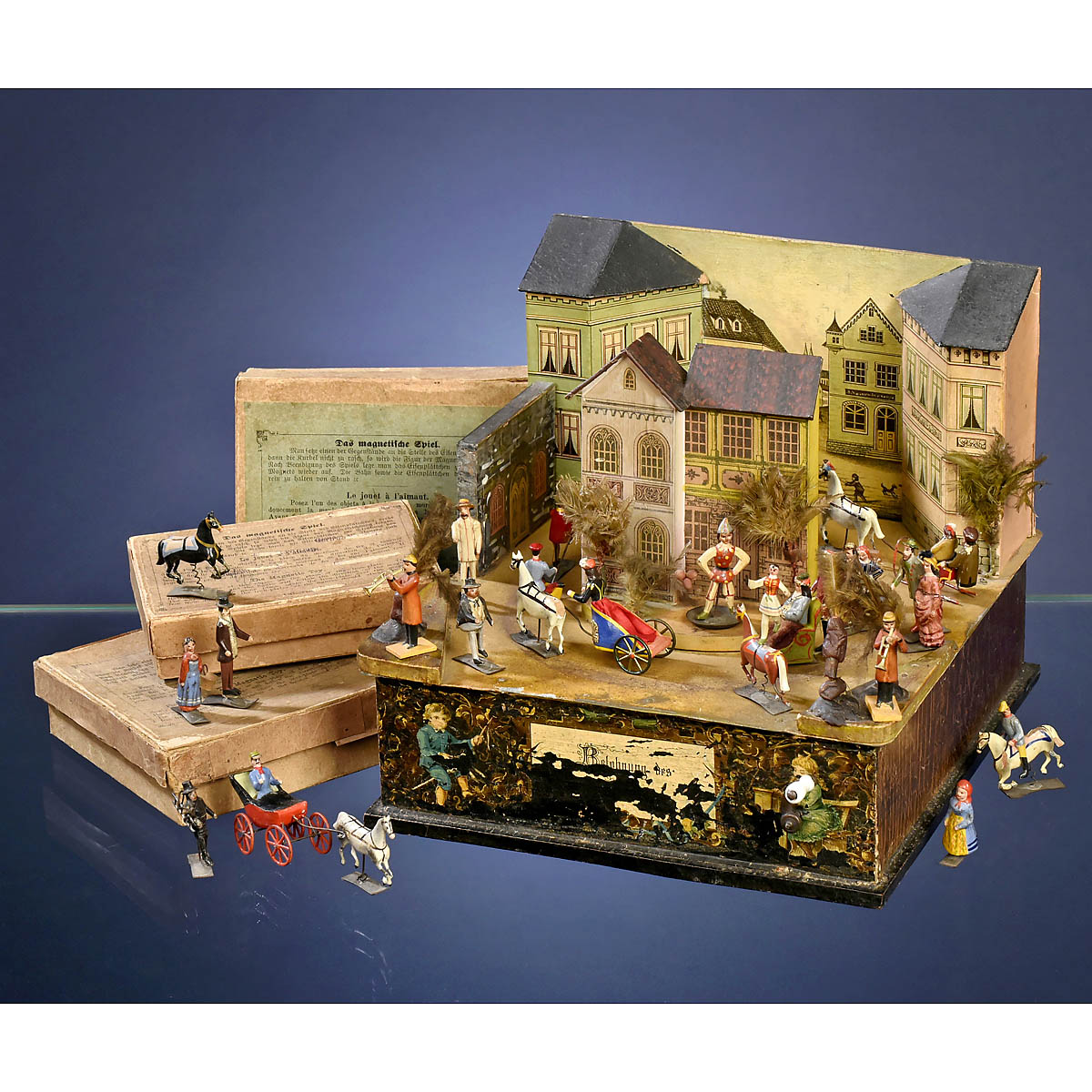 The Magnetic Toy, possibly by Zimmer & Söhne, Shalkau, Thuringia. Village scene with lithographed paper-covered houses, trees with feather foliage, hand-turned musical movement and painted metal plate with moving magnet beneath, base 8 ¼ x 8 ½ in. (21 x 22 cm). – With twenty carved and painted wood figures, including horses, a pulling buggy, chariot and a sled, trumpeters, chimney sweep, clown, dancer on a horse, soldier and pedestrians, in 3 original card boxes with instruction labels in German, French and English: "Place one of the objects at the place of the iron-plate. Turn slowly the handle and the figure will follow the direction of the magnet. Having finished the game, place again the iron-plate over the magnet. The way as well as the iron-plates of the figures should always be kept free of dust etc." – Good original condition, bright colors, figures with minor losses, musical movement functions well, magnetic function inactive.