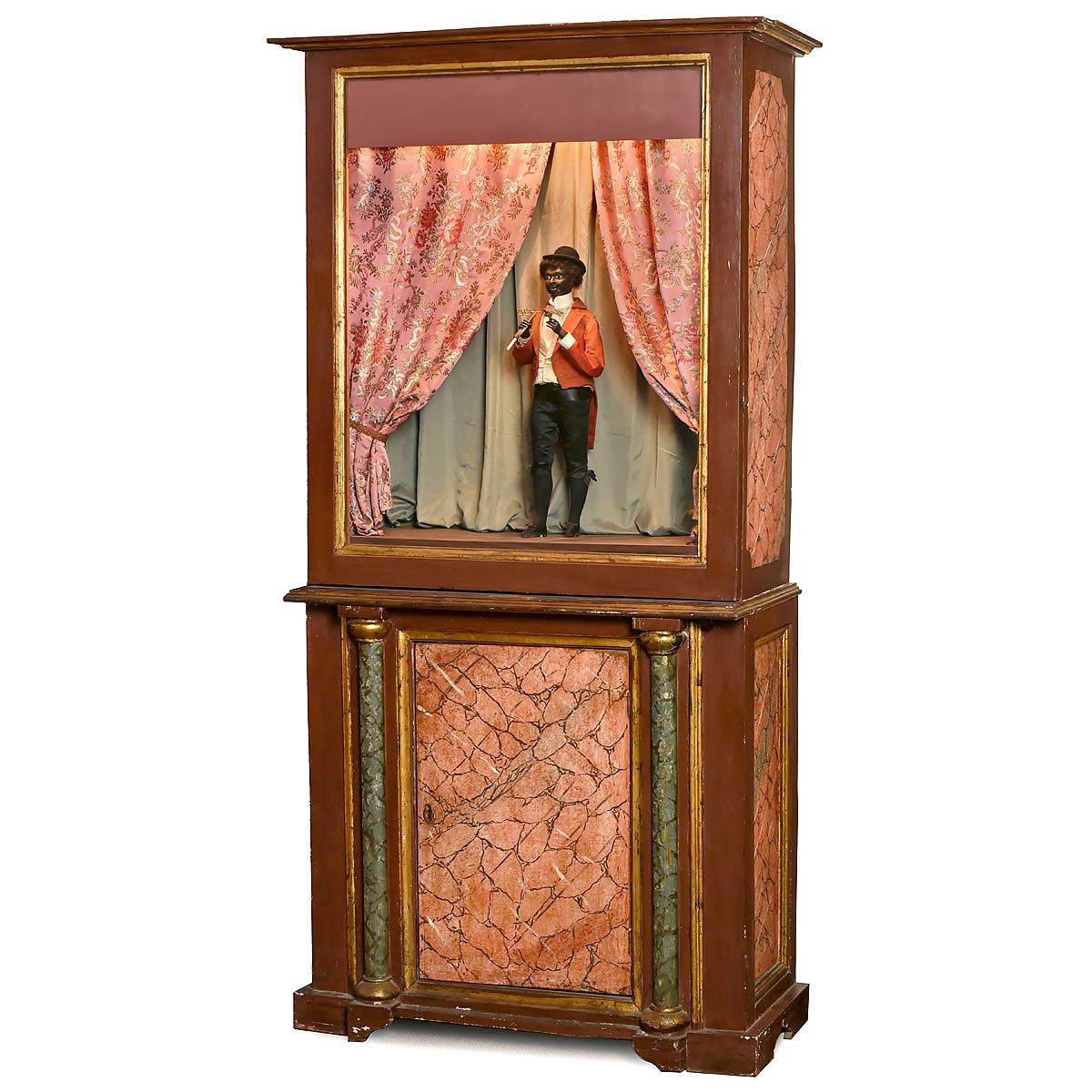 Depicting an elegant black dandy with papier-mâché head, brown glass eyes, bisque hands holding lorgnette and cheroot-holder, red tailcoat, original cream satin waistcoat and black breeches, shapely papier-mâché body containing bellows and original non-operative clockwork motor. A separate electric motor causes the gentleman to turn his head, raise a lighted cigarette to his lips, incline his head, exhale the smoke and then lift the lorgnette inquisitively. In marbled wood cabinet with glazed upper section and paneled base with door, figure 22 ¾ in. (68 cm) with hat, cabinet: approx. ht. 80 x wd. 37 ½ x dp. 18 ½ in. (202 x 94 x 63,5 cm), two fingers repaired on left hand. Good working condition and an impressive smoker! – Provenance: Former collection of Atracciones Apolo, an indoor amusement park opened by Josep Vallés Rovira on Parallel Avenue, Barcelona, in 1935. One of the park's most famous attractions was the Museo las Maravillosas Figuras en sus Dioramas (Museum of Marvellous Figures in their Dioramas), a collection of 19th century French automata in fantasy settings designed and painted by the artist Martí Llauradó. – According to an article published by Edición del Domingo on 19 August 1990, the Apolo's automata museum closed in 1957. The automata were stored, forgotten, for almost fifty years until acquired by the Museum of Toys and Automata in Verdú. A rare and historic piece from one of Spain's oldest amusement parks. – References: "A Great and Magical Collection", museum catalogue, pp. 313–325; Ròmul Brotons, "Parcs d'Atracciones de Barcelona", pp. 143–147; Auction Team Breker, 7. November 2015, Lot 628 and 5. November 2016, Lot 530 for other Apolo automata from the series.