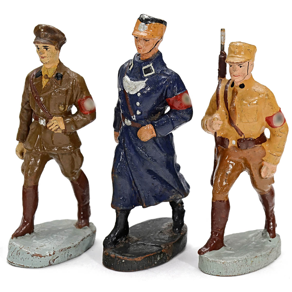 Wooden guard house, stamped on the base "D.R.G.M. – 1272904". Width 10 5/8 in., with SA auxiliary police, Berlin Brandenburg 1933, composition figure in blue coat, not found in the Elastolin catalogue! With an SA soldier with rifle and an SA group leader in winter uniform.