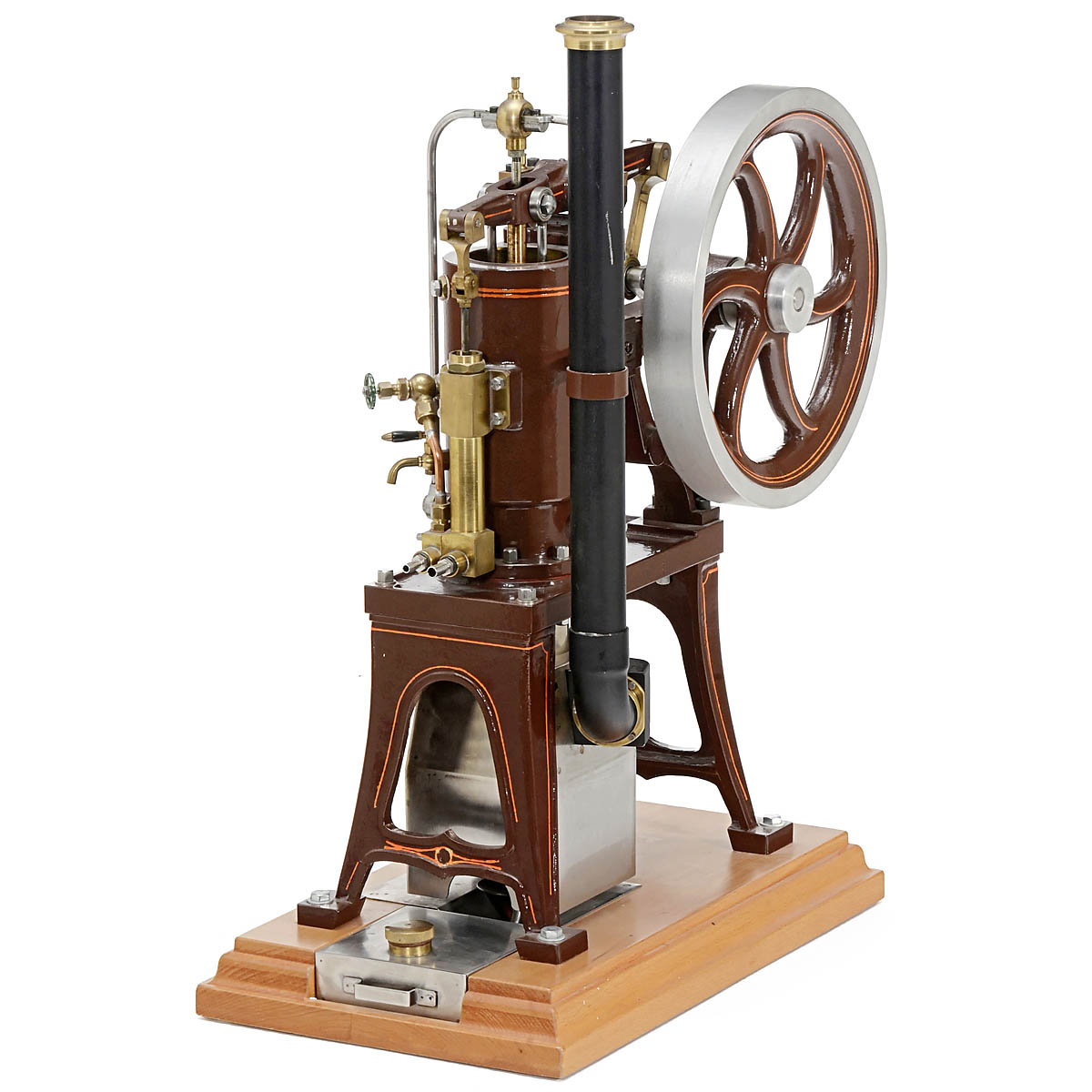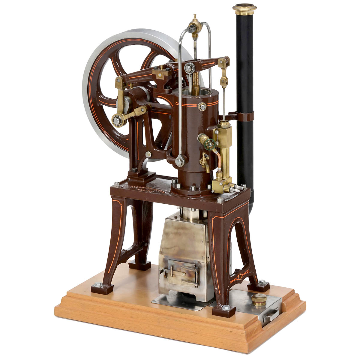 After the American original machine from 1888, parts made by Werner Wiggers. Power piston and displacer within one cylinder, water-cooled, 8 ¾-inch flywheel, overall size 14 1/5 x 8 3/4 x 20 ½ in., vaporizing burner. – A well-constructed working model.