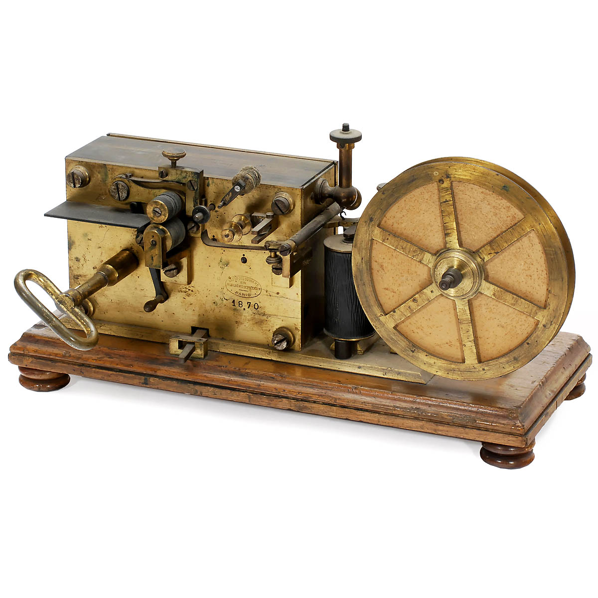No. 1870, manufactured by L'Association des Ouvriers en Instruments Précisions, for "Adminstration des Postes et des Télégraphes", brass, working spring motor, on wood base.
