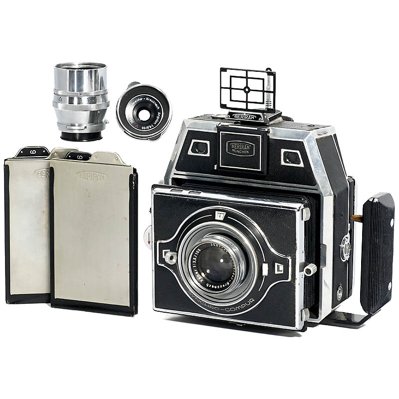 E.&W.,Bertram,慕尼黑,size6x9cm,no.1180,3个施耐德镜头,"Angulon6.8/65","Xenar3.5/105","Tele-Xenar5.5/180".有镜头盖,取景器,2个双盒。仅仅制造了2000台相机。