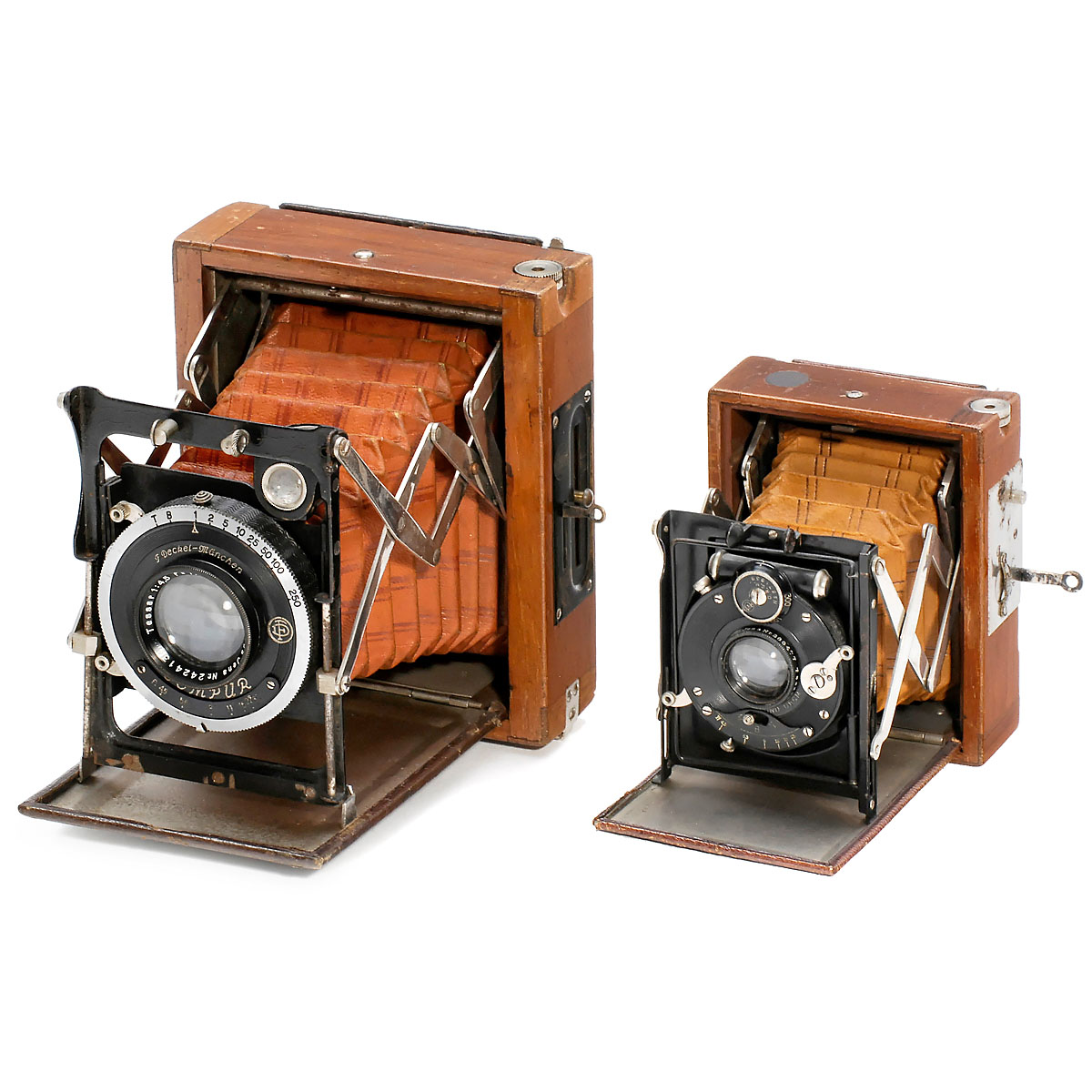 1) Körner & Mayer (Nettel-Kamerafabrik/Contessa-Nettel). Tropen Sonnet 4,5 x 6 cm, c. 1914, Tessar 4,5/7,5 cm in Compound (working), focusing screen back (screen missing). – Extremely rare camera, produced by Körner & Mayer (later Contessa-Nettel). (2–3/2–3) – And: 2) Contessa-Nettel. Tropen Sonnet 6,5 x 9 cm, c. 1920, Tessar 4,5/11,5 cm in Compur, frame-finder missing. (3-/4)