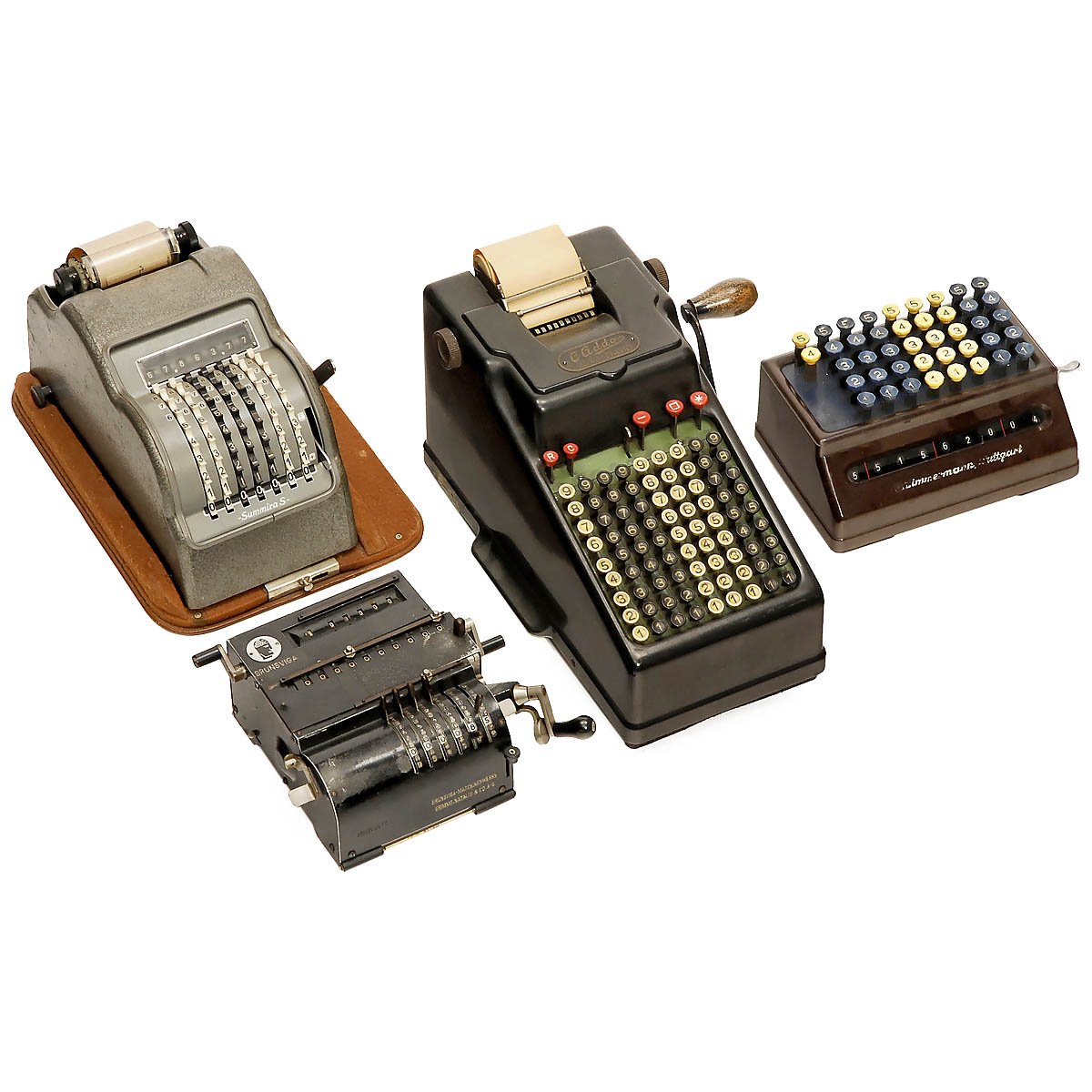 1) "Brunsviga 10" stepped gear mechanism, no. 152917. - 2) "Madix HM", by VEB Dresden. - 3) Rapid adding machine "Contex A", Denmark. - 4) Adding machine "Thales", Germany. - 5) "Brunsviga 90TA", Germany. - 6) "Resulta P9", with printer, Germany. - 7) "Summira S", with printer, lever without handle. - 8) "Torpedo", rapid adding machine, bakelite case. - And: 9) "Addo 6", Sweden. - Apart from the "Torpedo", all in working condition.