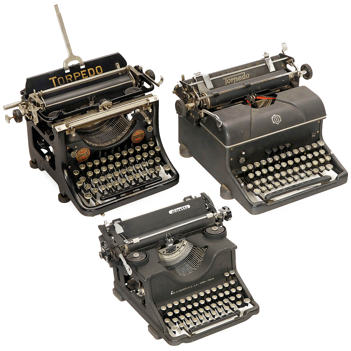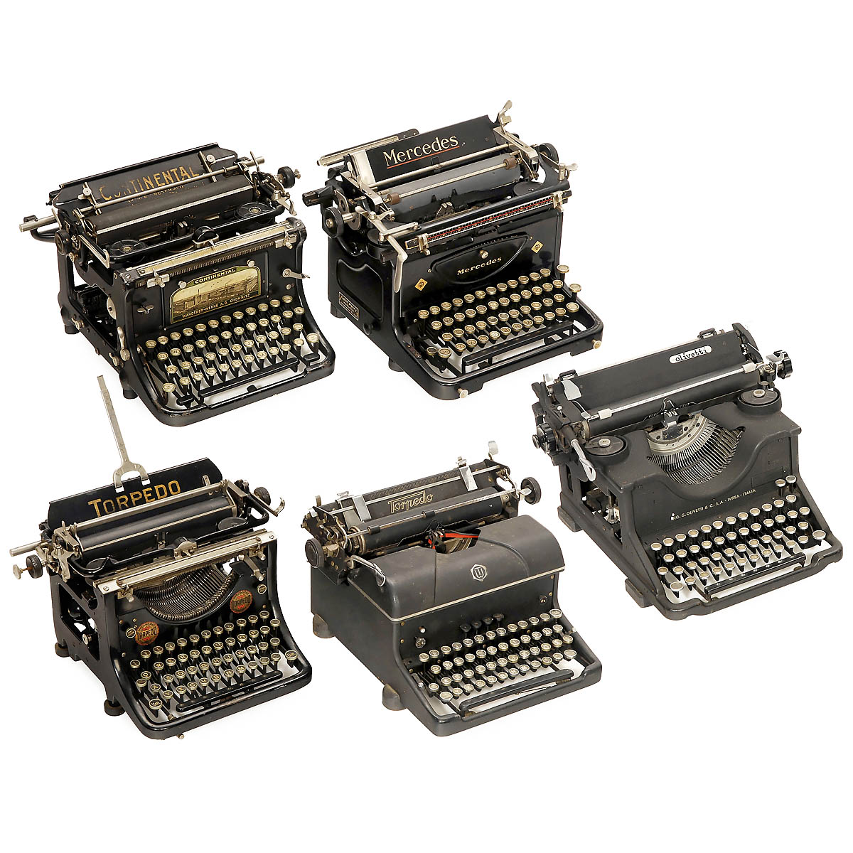 1) "Torpedo", Weilwerke Frankfurt, with spaced-type feature. (2/2) - 2) "Torpedo", TW. (3/3) - 3) "Continental", Wanderer Werke, Chemnitz, Germany. (2-3/2) - 4) "Mercedes", Thuringa. (2/2) - And: 5) "Olivetti", Ivrea, Italy. (2-3/2)