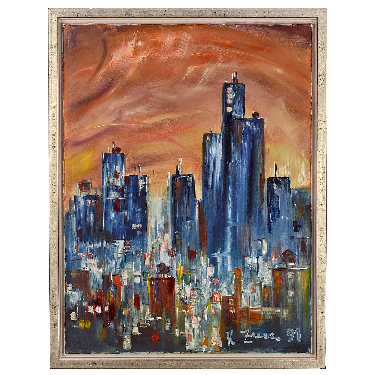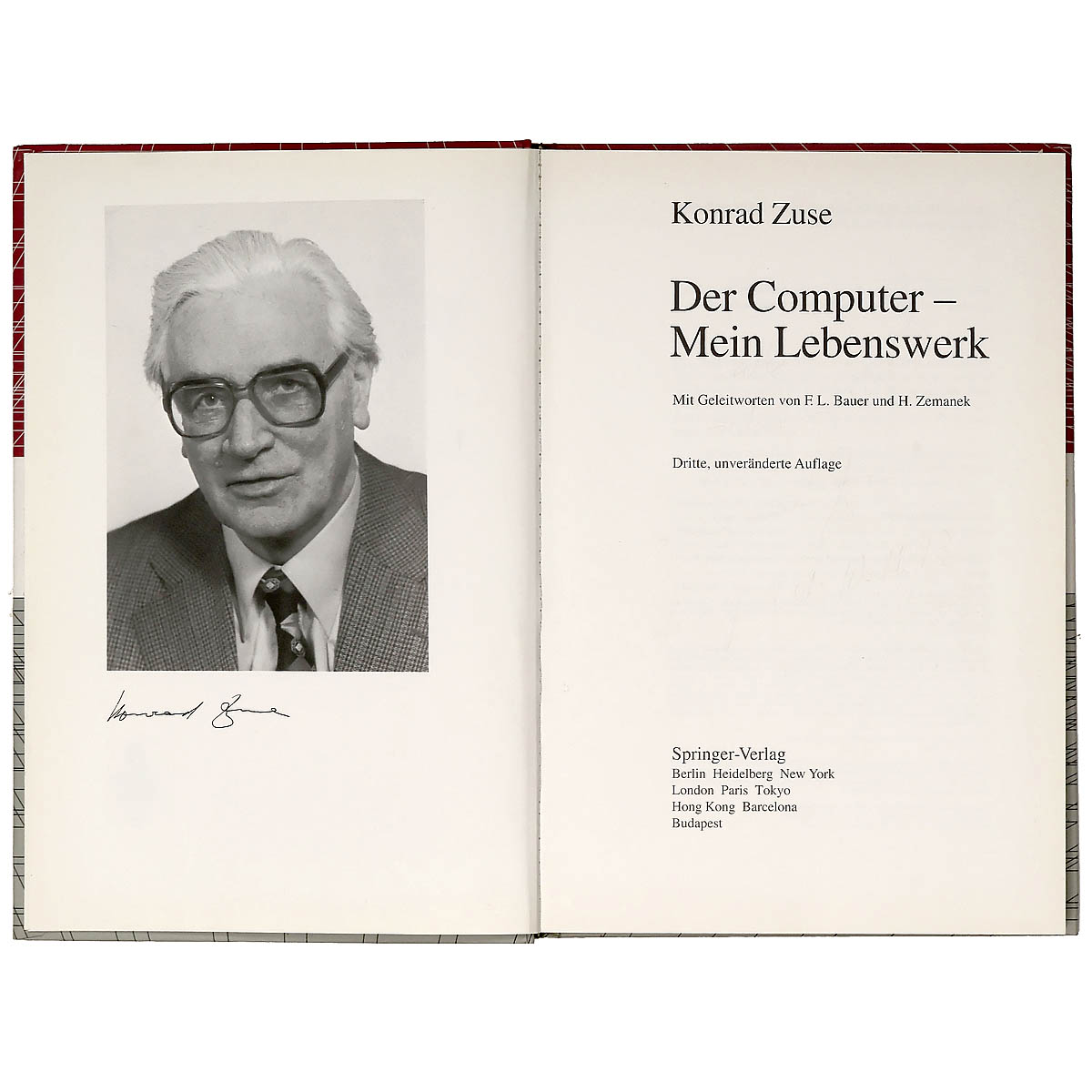 Oil on canvas, signed on lower-right side "K. Zuse 91", 23 3/5 x 31 ½ in., 26 1/3 x 34 ¼ in. framed. - Konrad Zuse (1910-1995), civil engineer, artist and pioneer of information technology, is widely recognized as the inventor of the first programmable electro-mechanical computer. Born in Berlin in 1910, Zuse studied architecture and engineering at the Technische Hochschule Berlin-Charlottenburg 1927-1935. - The young Zuse began designs for a computer as early as 1934. His first project, the "Z1", a mechanical calculator that read instructions from 35mm film, was completed in 1938. The "Z2" followed in 1940, succeeded by the revolutionary "Z3", the first programmable calculator with memory and a calculation unit based on telephone relays, in May 1941. Groundbreaking research into machine code resulted in the first high-level programming language, "Plankalkül", written for a computer. - Zuse's sense of form and space found only partial expression through his mathematical work. An early interest in design included drawing, photography and the Expressionist movement. The attempt to define space in all its concrete and abstract elements became a guiding principle. In his 1969 discourse, "Rechnender Raum" ("Calculating Space"), Zuse visualized the cosmos as a giant computer that could not be influenced externally. Zuse's autobiography describes how architecture appealed to his artistic side like a "tantalising mirage" while his profession represented "the ideal combination of artist and engineer". His controlled abstract works and urban landscapes, with titles such as "Stadtvision" ("Vision of a City"), "Kosmischer Raum" ("Cosmic Space") and "Bestrahlte Architektur" ("Irradiated Architecture"), show Zuse's preoccupation with space as a physical as well as a theoretical concept. - By 1962 the 52-year-old Zuse was devoting ever more time to his art, working in oils, watercolor and chalk. Later paintings were signed with the pseudonym "Kuno See", in order, as he wrote in 1988, to "make a clear distinction between my main work, computer development and information technology, and my artistic activities". - Konrad Zuse's status as the grandfather of information technology was cemented at the 1994 IFIP Congress (International Federation for Information Processing) in Hamburg with the presentation of his twelve chalk portraits of German computing pioneers. At CeBit '95 fair in Hannover the following year, he presented this portrait to Microsoft co-founder Bill Gates, commenting: "I admire Bill Gates as a successful business man but I do not envy him. His successes have required a resolute dedication. The responsibility is high and the well-being of the economy and of the United States depends ever more on the quality of the software in the most diverse of areas". - Zuse's work is to be found in national German collections, including the Konrad Zuse Museum in Hünfeld, the Astronomisch-Physikalisches Kabinett in Kassel and the Staatliche Graphische Sammlung in Münster. - Accompanied by the book "Der Computer - Mein Lebenswerk", Konrad Zuse, 1984, with original dedication from Konrad Zuse 10.11.1993.