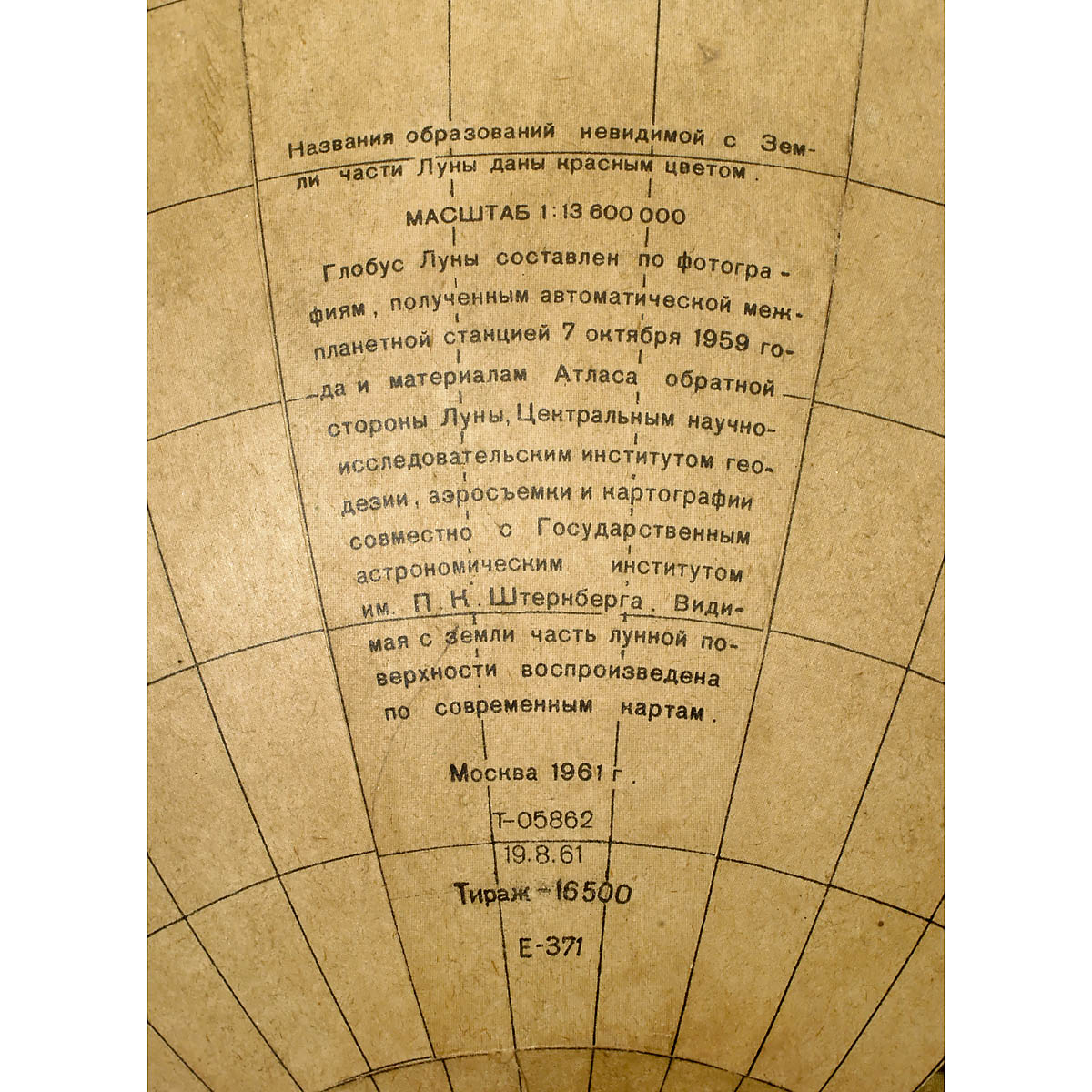 Moscow, 10-inch diameter, scale 1:13.600.000, dated 19.08.1961, 12 green and cream-printed gores, labeled in Cyrillic script, named regions, craters and mountains, the then unexplored dark side of the moon without markings, on bakelite base, 14 ¾ in. high.