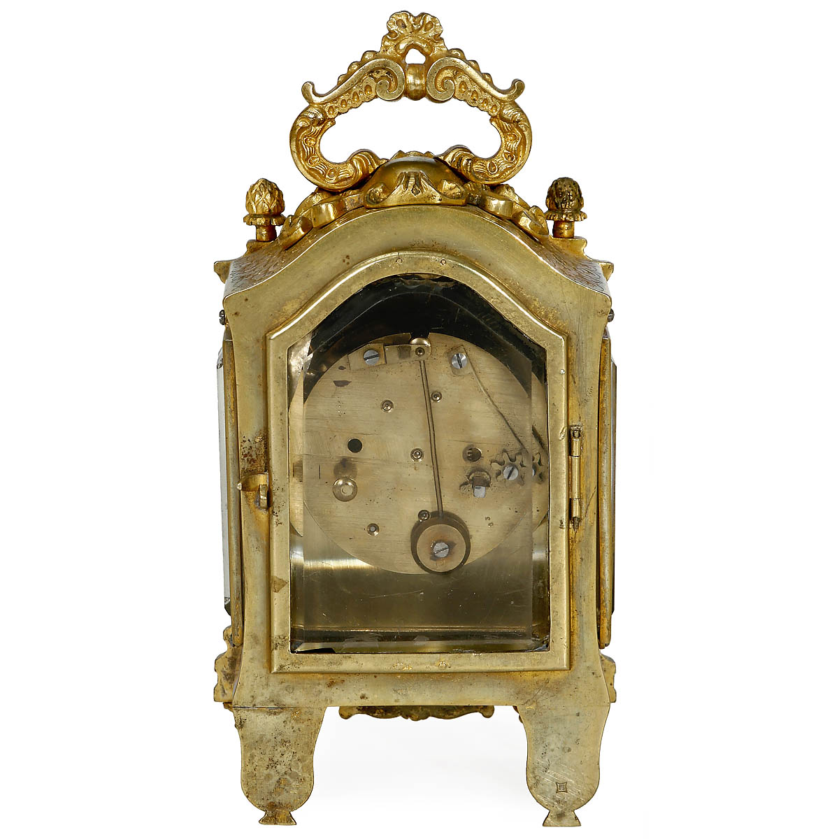 Unmarked, gilded brass case, enameled dial Ø 2 in., single-train pendulum movement, lateral bell, with key, loose rear glass, working (not guaranteed), height 7 ¼ in.