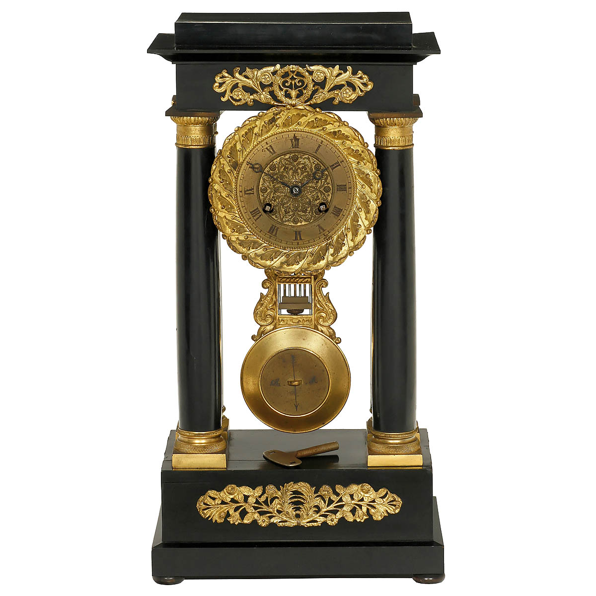 Paris, movement signed "Pons", ebonized wood case, ormolu ornaments, 8-day movement, half-hour strike on bell, compensation pendulum, height 17 1/3 in., with key, movement runs for a short time.