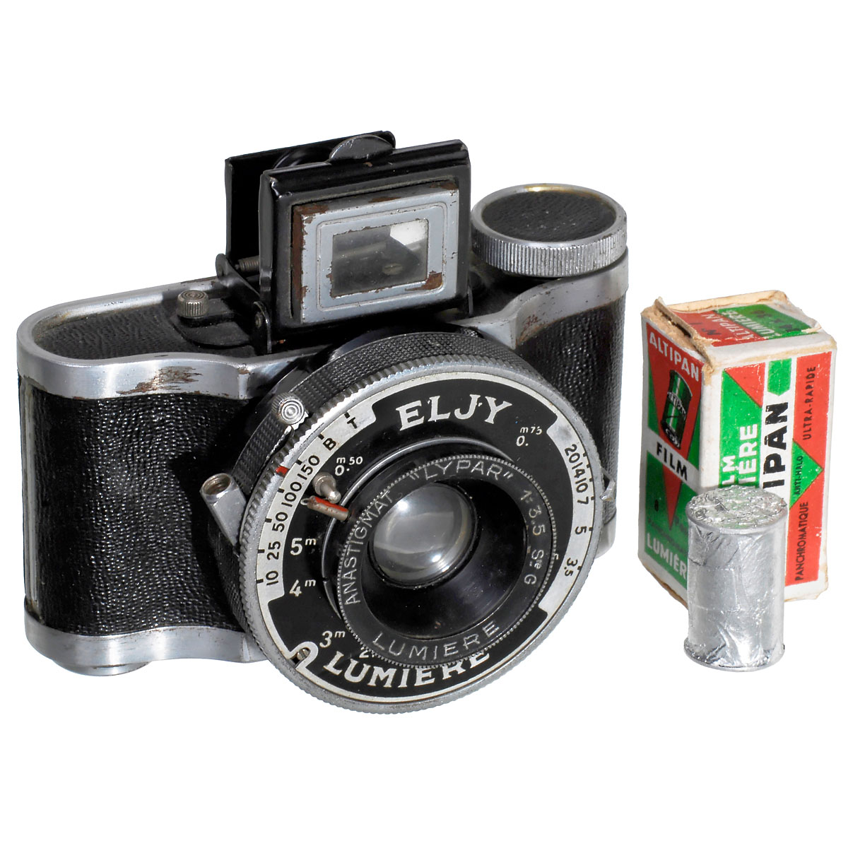 Lumière, Lyon. Metal body, black imitation leather, size 24 x 36 mm on rollfilm, Anastigmat "Lypar" 3,5, shutter speeds 1/10-1/150 sec. (uneven), with original rollfilm.