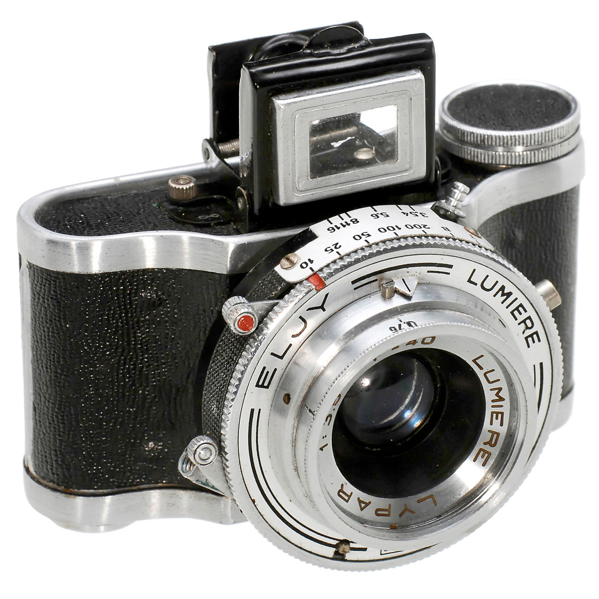 Lumière, France. Small camera - large format. Film size 24 x 36 mm on special rollfilm, lens Lypar 3,5/40 mm, shutter speeds 1/10-1/200 sec., folding viewfinder. Excellent, near-mint condition. With case.
