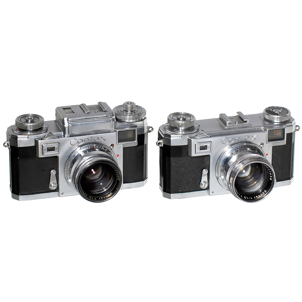 Zeiss Ikon, Stuttgart. 1) Contax IIa, 1950. No. T29362, with Sonnar 1,5/5 cm, no. 2037638, shutter not working. (2-3/4) - Ánd: 2) Contax IIIa, c. 1954. No. D78328, Sonnar 1,5/5 cm, no. 1168885, light meter working. (3+/2)