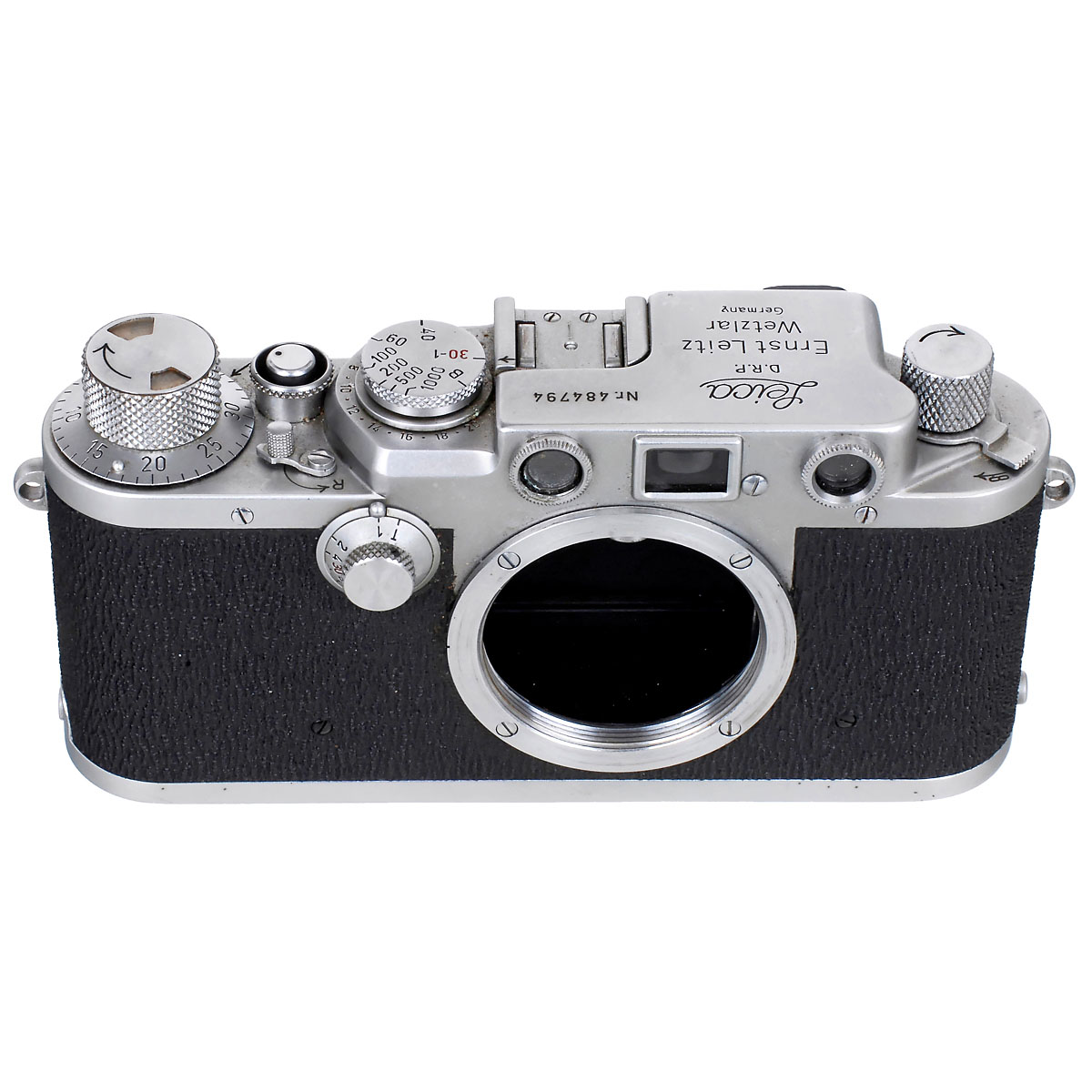 Leitz, Wetzlar. 1) Leica IIIc, converted to IIIf, no. 484794, 1949. "Sharkskin" vulcanite, black-dial synchronization. Good technical condition. (2-3/2) - And: 2) Leica IIIf, no. 535181, 1950. Black-dial synchronization, Elmar 3,5/5 cm, no. 640428, meter scale. (3/3)