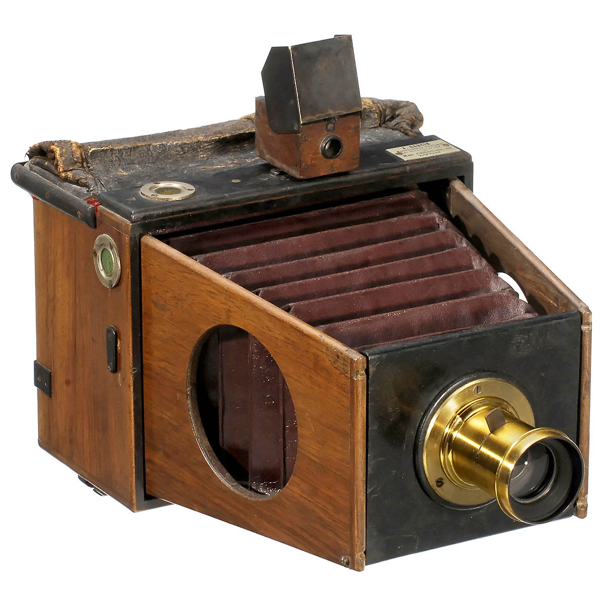 J. Garcin, Rue Childebert, 50 Lyon. Strut camera with built-in magazine for plates of 13 x 18 cm, changing bag, polished wood with wood struts, dark-red concial bellows, lens: Rectiligne No. 2 by L. Puech in Paris, no. 12960, with one waterhouse stop, original viewfinder. - Literature: "Les Appareils Photographiques Français", no. 158.