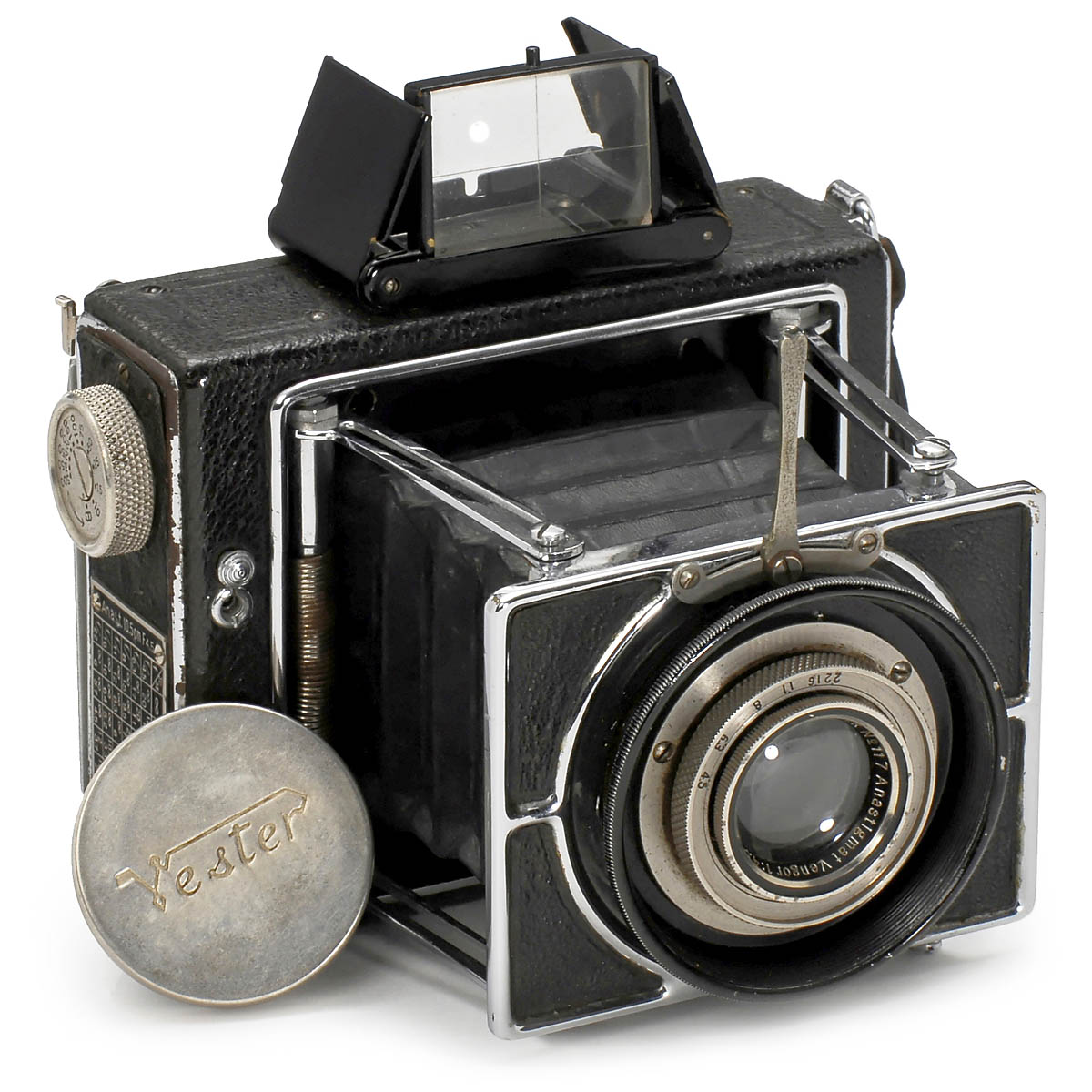 Ginrei Photo Works, Japan. Strut camera for plates of 6 x 9 cm or rollfilm, copy of the Ernemann "Klapp-Camera" of 1920, focal plane shutter 1/500 sec. (stuck), Fuji Anastigmat Vengor 4,5/10,5 cm. With focusing screen back, 6 cassettes and original case.