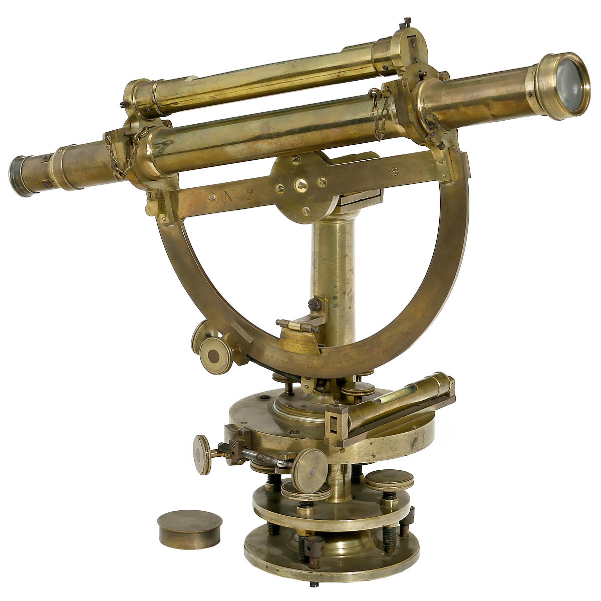 No. 2, signed on the vertical half-circle scale, brass, 2 spirit levels, telescope with rack-and-pinion focusing, length 16 1/6 in., half-circle Ø 8 7/8 in., overall height 12 1/5 in., on four adjustable screw feet.