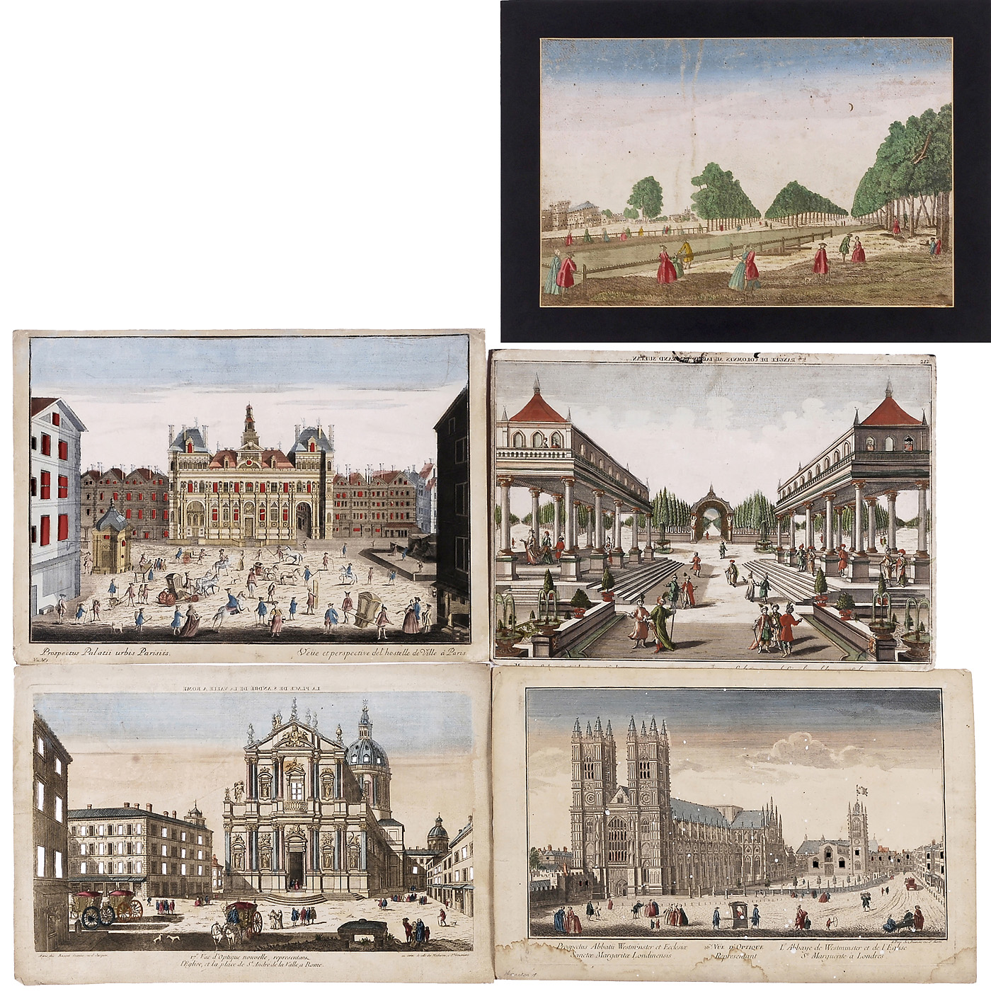 Original hand-colored copperplates with pin-prick and cut-out light effects, some lined with colored tissue paper. 1) Veüe et perspective del'hostelle de ville à Paris. - 2) L'Abbaye de Westminster et de l'Eglise Ste Marguerite à Londres (with white stains). - 3) L'Eglise, et la place de S.t André de la Valle, à Rome. - 4-5) Without title (1 x with passe-partout and 1 x down cut). - Size 10 x 16 1/6 in.