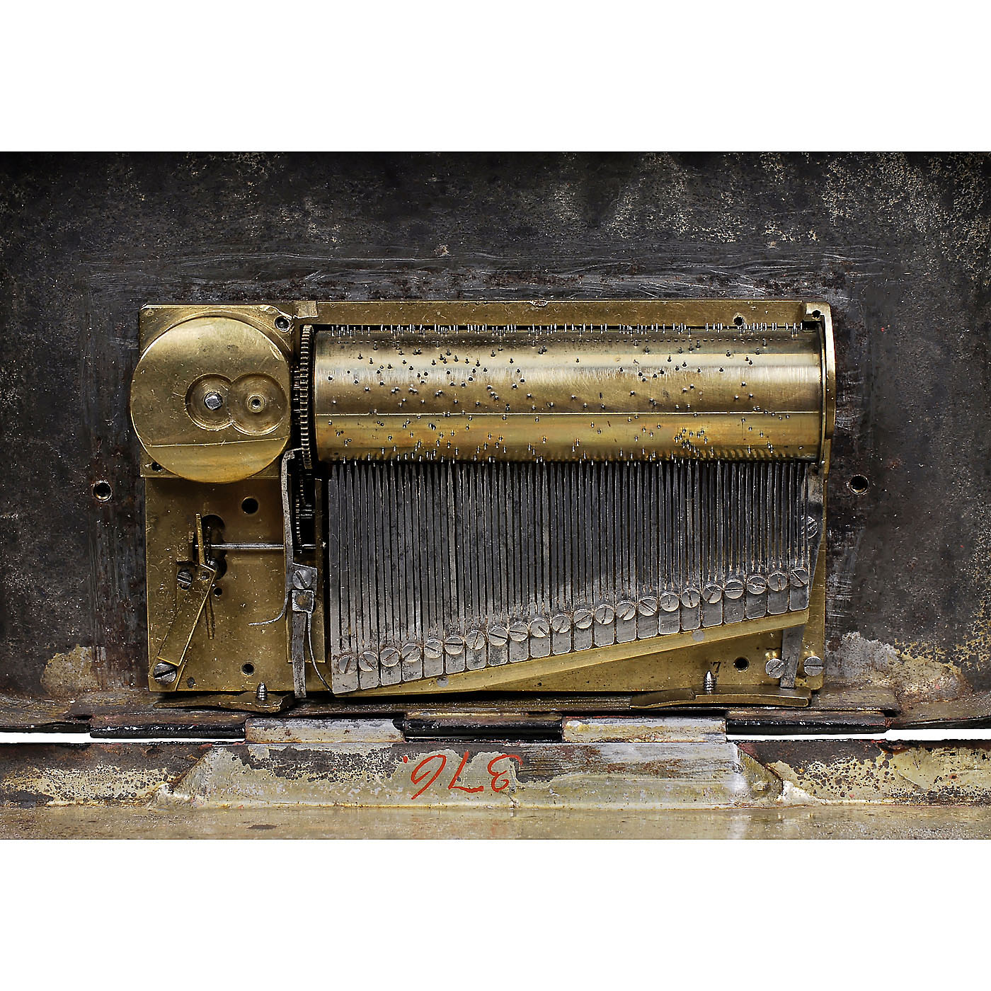 No. 376, playing two airs, with sectional comb in 22 groups of 3 teeth (complete), in tin case with silver cover for the movement and painted lid depicting a young woman, wd. 5 ¾ in. (14,5 cm), cylinder 2 3/8 in. (6 cm), case sides now painted black, minor losses on lid, playing condition. With key. An attractive and unusual early musical box.