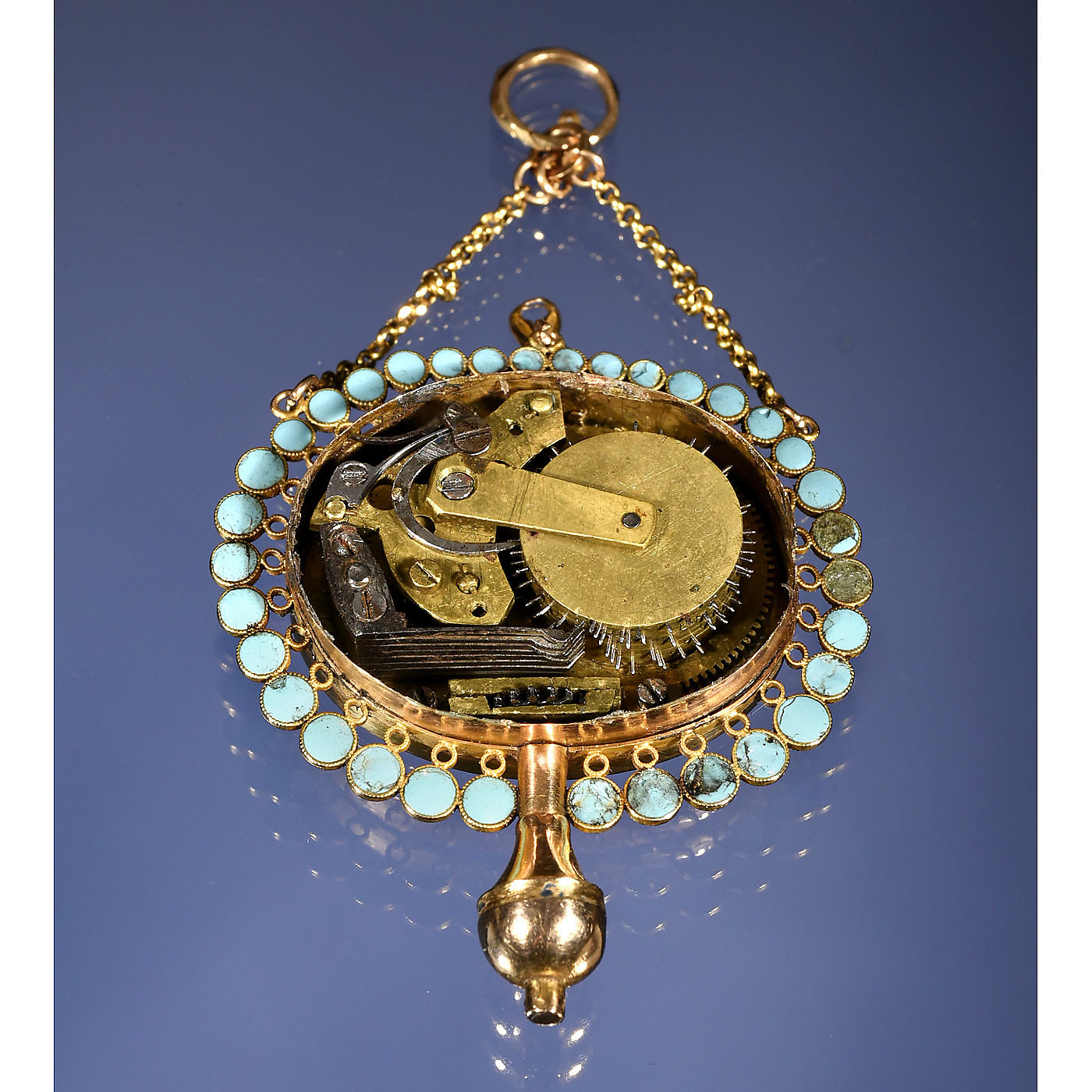 Playing a single air, with barillet movement, 8 hooked teeth, bulb-shaped winding stem, turquoise-set filigree border around oval body of champlevé enameled decoration, a shield-shaped medallion with floral study on the front and a hinged glass cover for a miniature portrait or lock of hair on the back, wd. 1 ½ x ht. 1 ¾ in. (4 x 4,5 cm), with suspension chain, several turquoises chipped, movement in unrestored working condition. - A superb piece of musical jewelry.