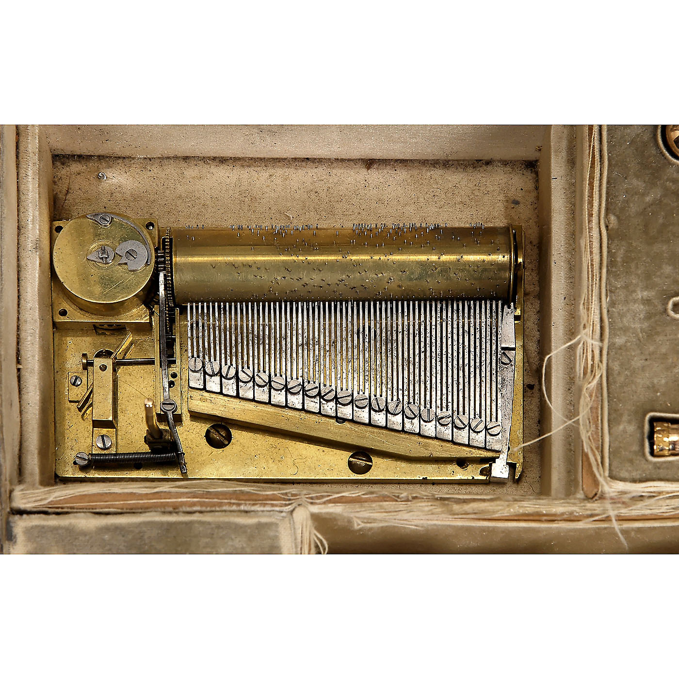 Comprising 14-carat seed-pearl-set gold fob watch, no. 37625, with fusee movement and three-color chased design of flowers and ferns; two recessed compartments containing gold, steel and gilt implements: scissors with guard, thimble, spools, tape measure, pencil, engine-turned and engraved needle case and two pill-boxes with hallmarks. - Two-air cylinder movement with solid bedplate and sectional comb in 19 groups of 3 (complete), bass teeth to the right. - In tortoiseshell case with ball-and-claw feet and printed silk picture in the lid, wd. 8 ¼ x dp. 5 ½ x ht. 3 ¾ in. (21 x 14 x 10 cm), cylinder 2 1/8 in. (6 cm). Musical movement in good playing condition, watch untested, missing one seed-pearl. With key. An exquisite objet de vertu. - Literature: Illustrated in Luuk Goldhoorn, "Three of a Kind", in: "MBSGB - The Music Box", vol. 28, no. 4, pp. 138-139.