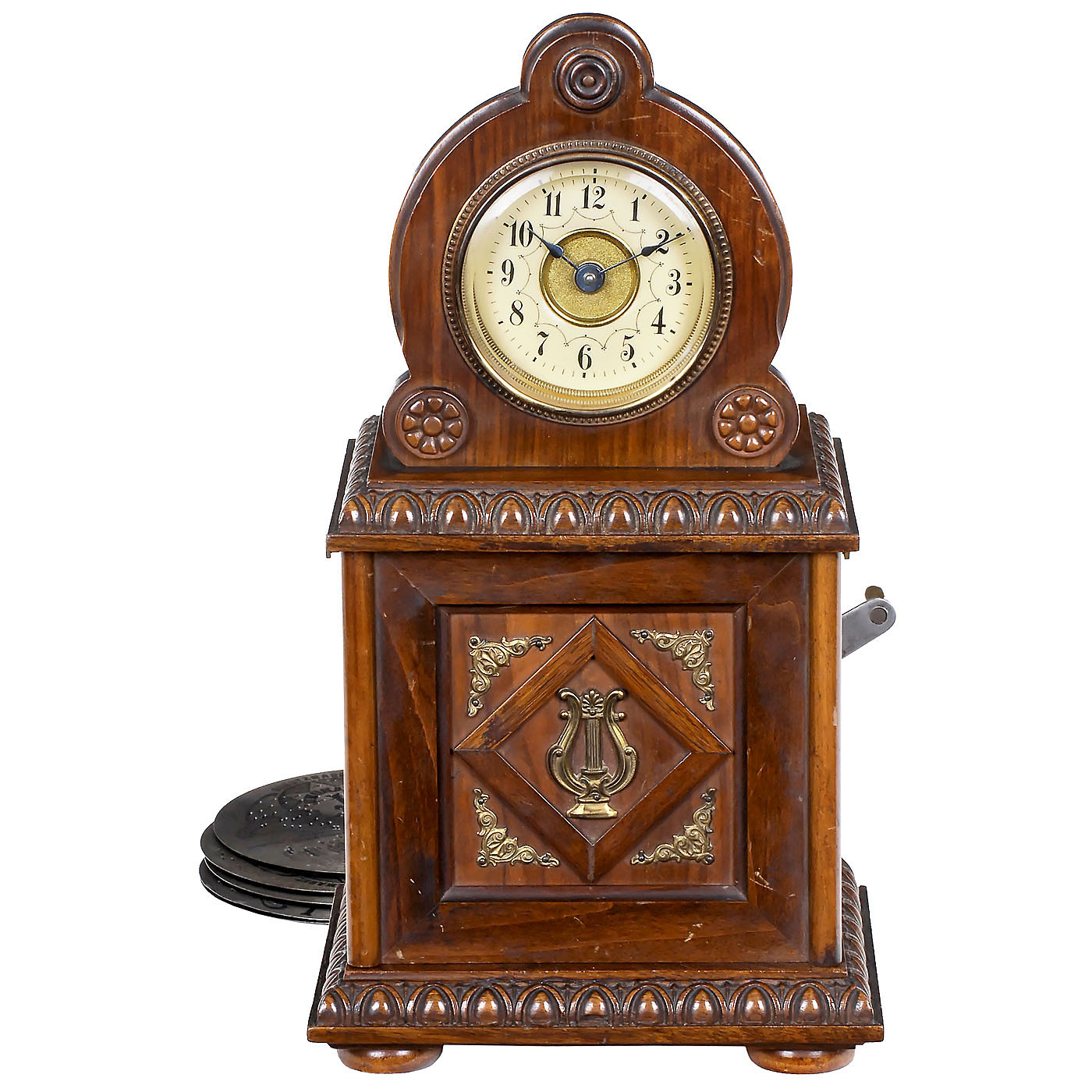 Schramberg, Black Forest. For 4 ½ in. discs, 30 teeth in steel comb (complete), brass-plate movement, anchor escapement, hourly release of the musical movement (optional), walnut case with brass ornaments, height 13 in., very good working condition, with 6 discs.