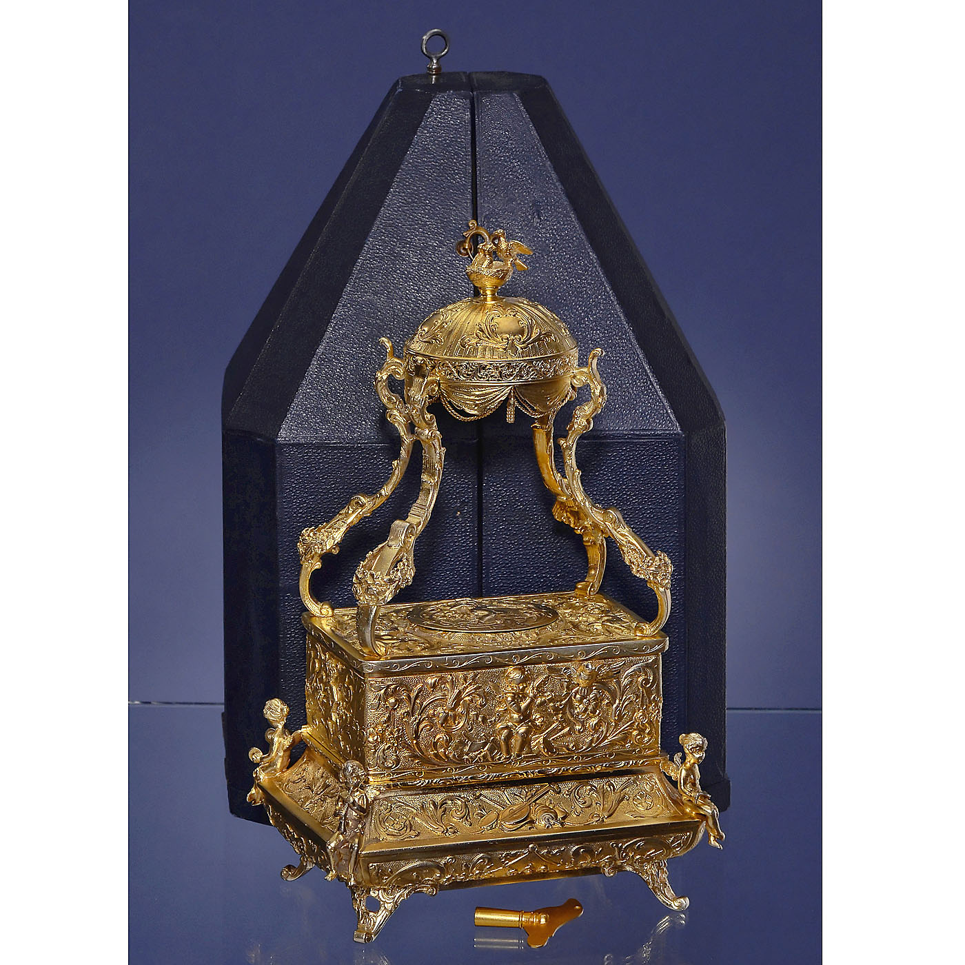 Model 11, with going-barrel movement, bird with moving metal beak, wings, tail and swiveling perch, in two-tiered case with repoussé decoration of putti musicians, flowering foliage and peacocks, under swag-bedecked canopy, with hinged lower section for winding and key-compartment, the underside with "Sterling" stamp and hallmarks: "P&M, 925", "i", ht. 8 in. (20 cm), with key, plumage oily, case refinished, in fitted leather-lined traveling case, ht. 9 ½ in. (24 cm). An impressive show piece, in good working condition. - Literature: Geoffrey T. Mayson, "Mechanical Singing Bird Tabatières", p. 158.