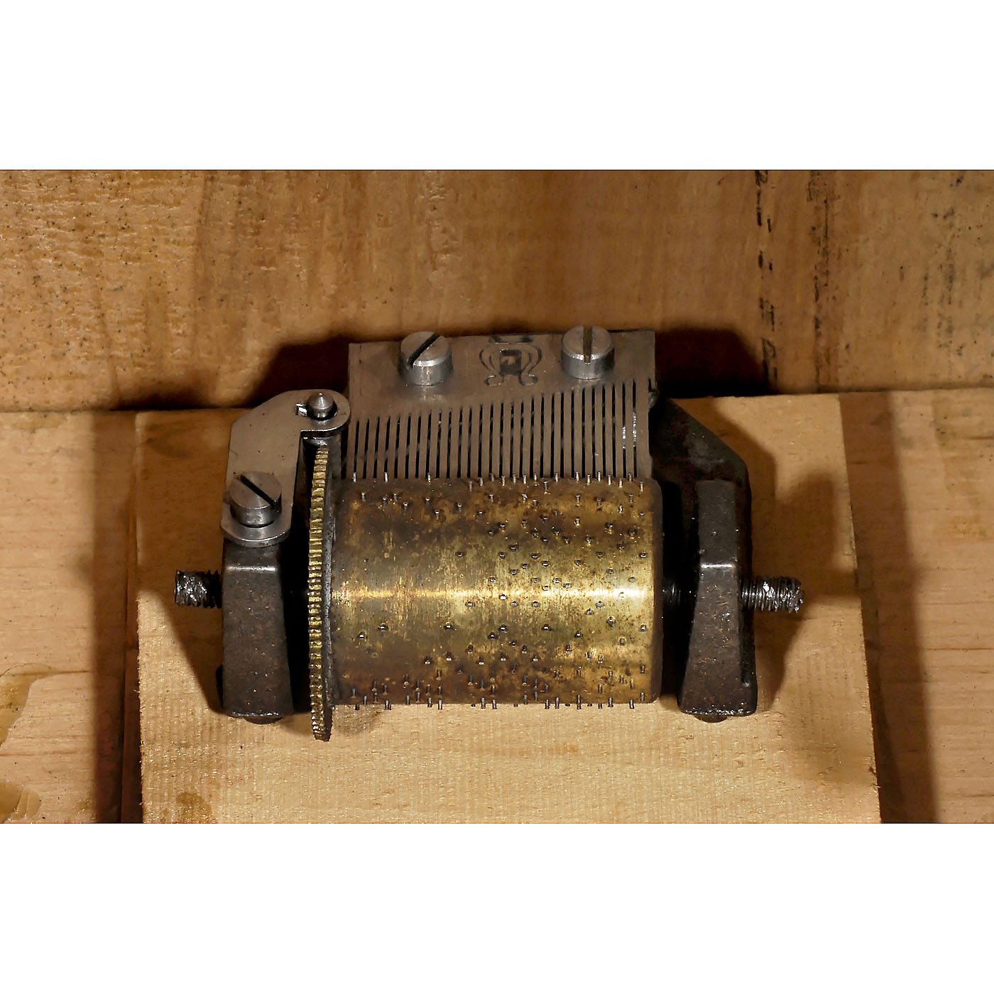 With hand-turned movement playing "Wenn ich ein Vöglein wär" ("If I were a little bird"), with lyre trademark on comb, ebonized wood case with turned corners and repoussé sound fret depicting a putti quartet, wd. 10 ½ in. (27 cm), wood split on top-left corner and on baseboard, otherwise in good original condition.