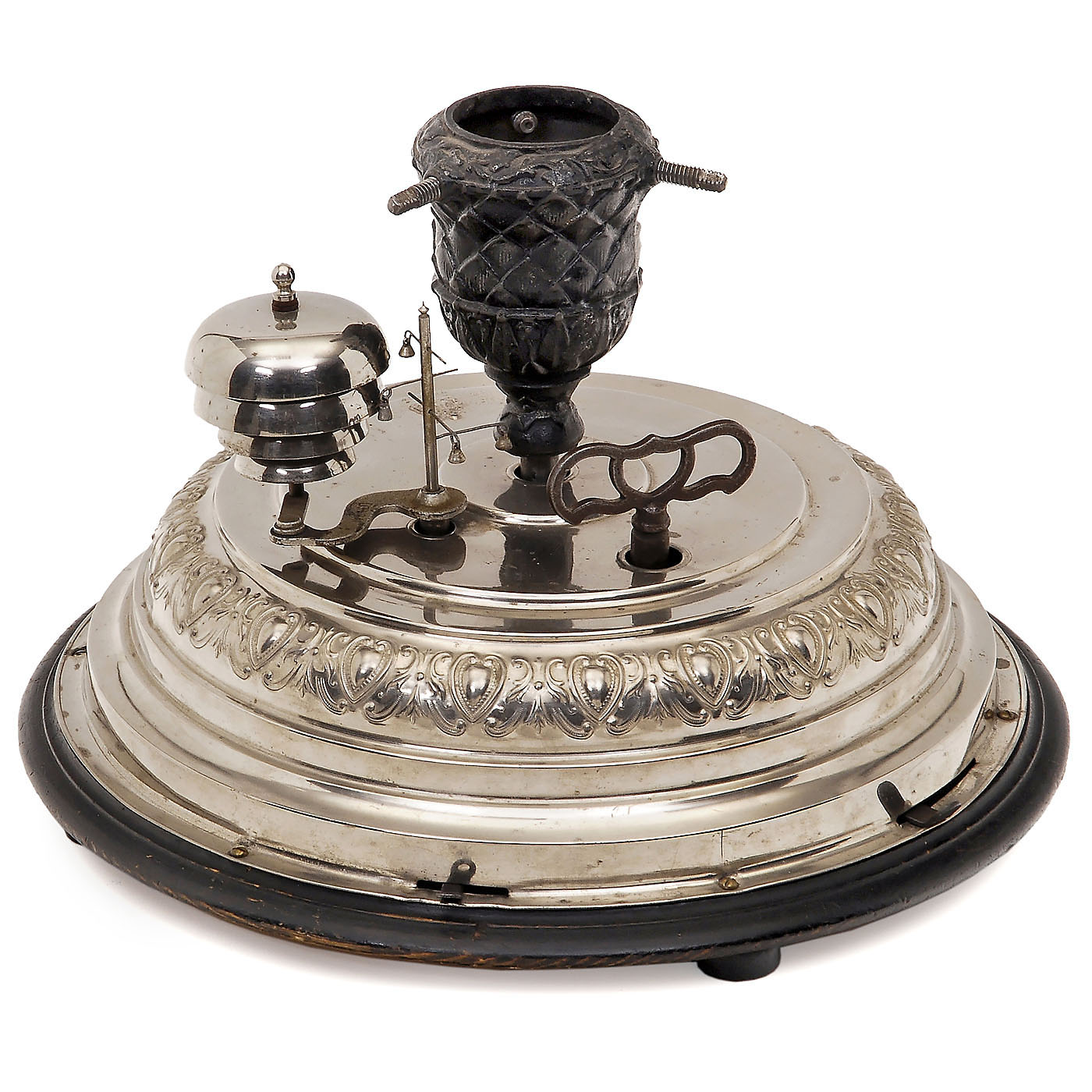 Embossed and nickel-plated sheet metal case on ebonized wooden base, Ø 13 ¾ in., long-running clockwork motor, two 2-air movements playing 2 Christmas songs and 2 other melodies, 4 visible chimes, working.