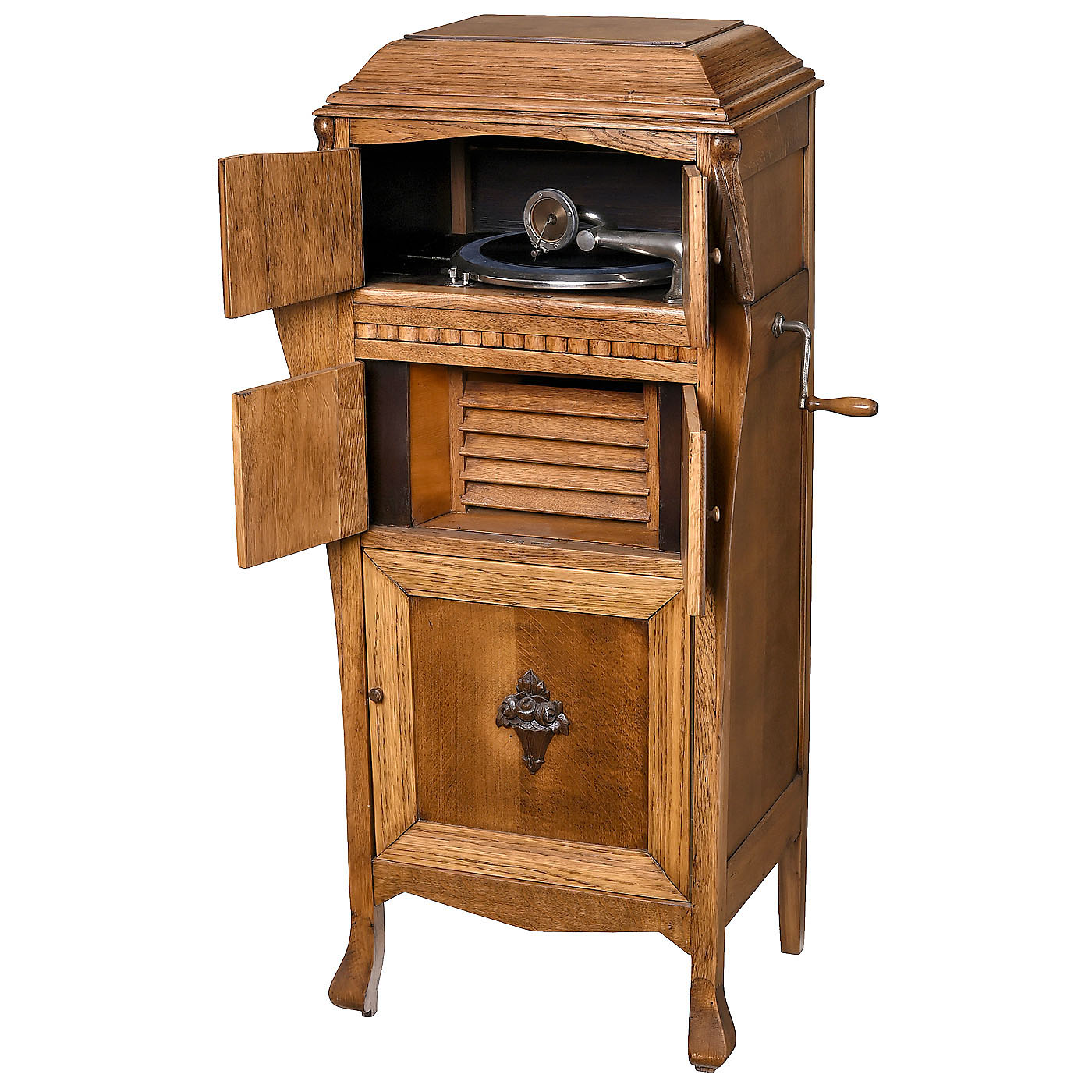 Unmarked, oak case with disc compartment, mica reproducer, very good playing condition, height 47 in.