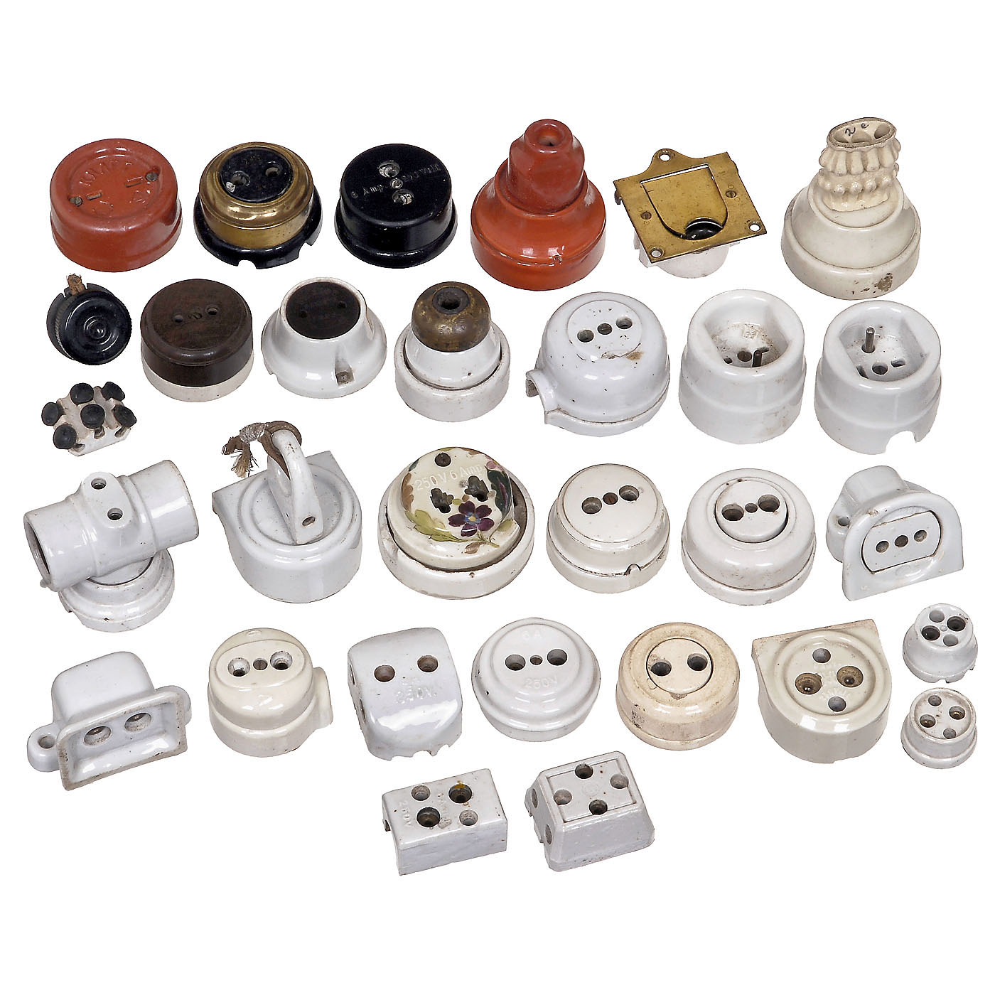 Porcelain, ceramic, bakelite, brass and other materials, predominantly up to 250 volts. 51 rotary switches, 17 lever switches, 1 pull switch, 5 push switches and 28 power sockets.